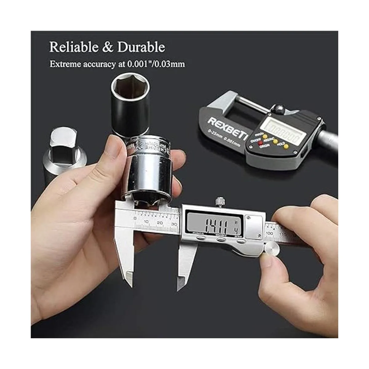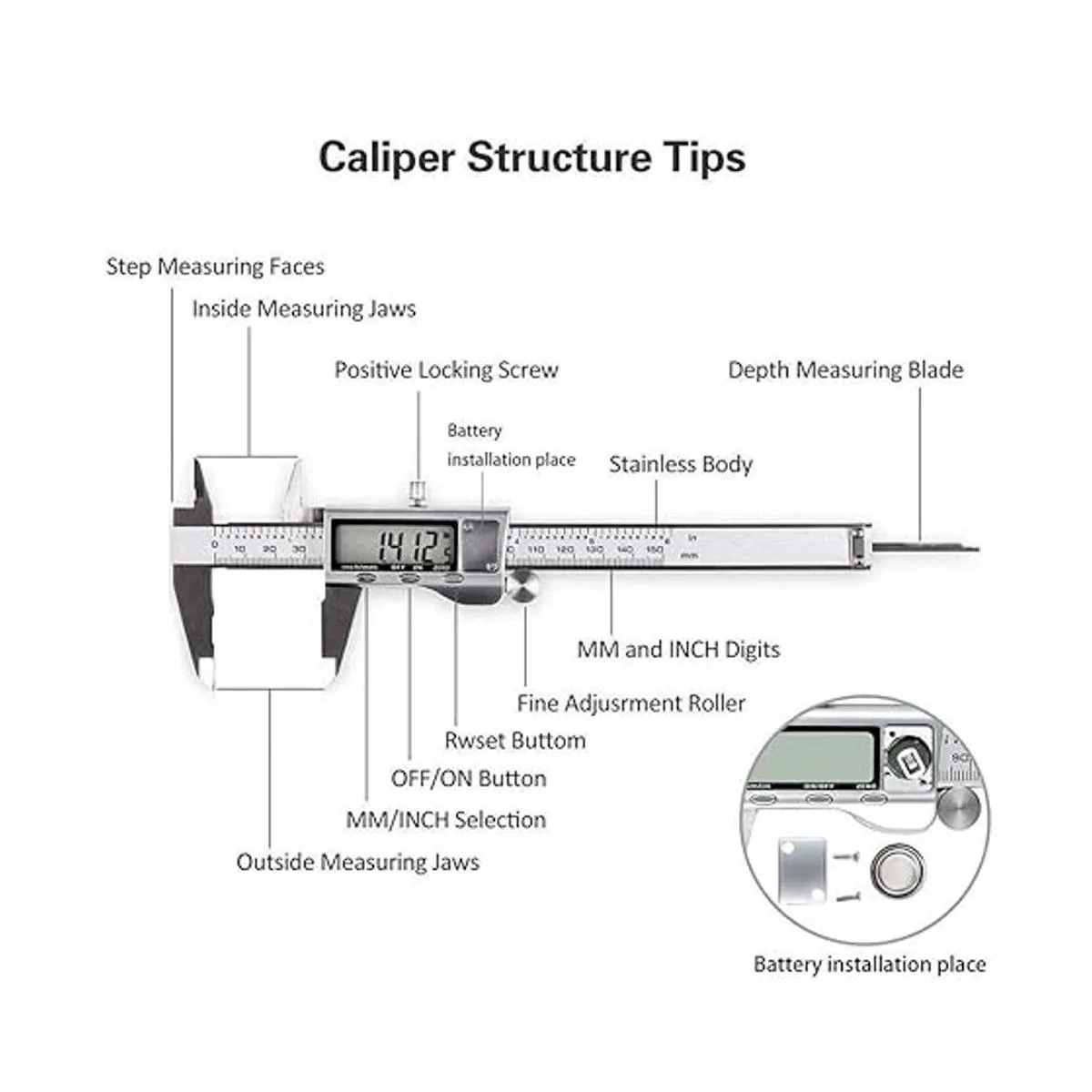 Medición precisa con función de apagado automático: este es un calibrador digital de 6 pulgadas, tiene la función de apagado automático y cero en cualquier posición, incluso si olvidas apagarlo, no tienes que preocuparte por que la batería se agote, porque se apagará automáticamente cuando no lo operes en 4 minutos. Rango de medición: 0 6 pulgadas / 0.000 5.906 in. Precisión: 0,001 pulgadas / 0.001 in. Resolución: 0,0005 pulgadas / 0.000 in