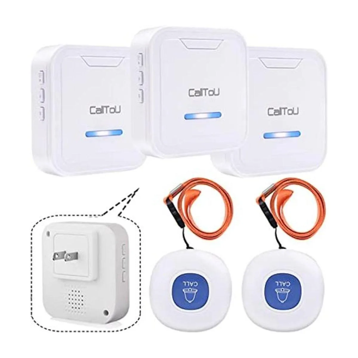 CallToU Sistema de botones de llamada inalámbrico para cuidadores, alerta de llamadas de enfermeras para ancianos, ancianos, pacientes, hogar, 3 receptores, 2 botonestransmisores impermeables