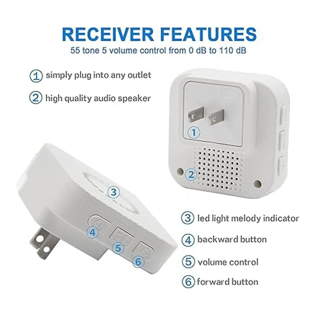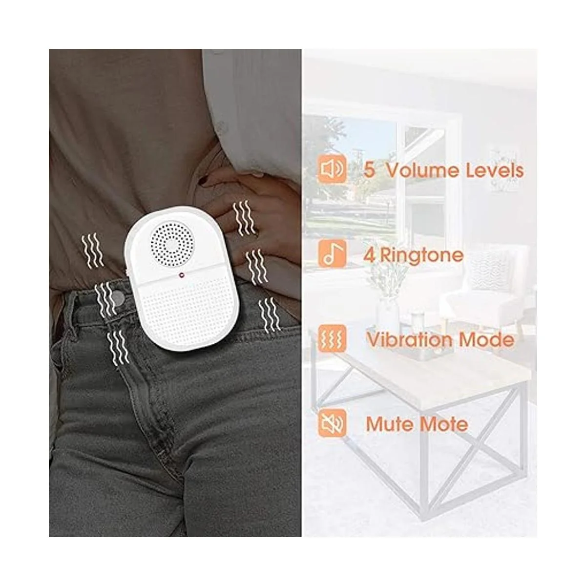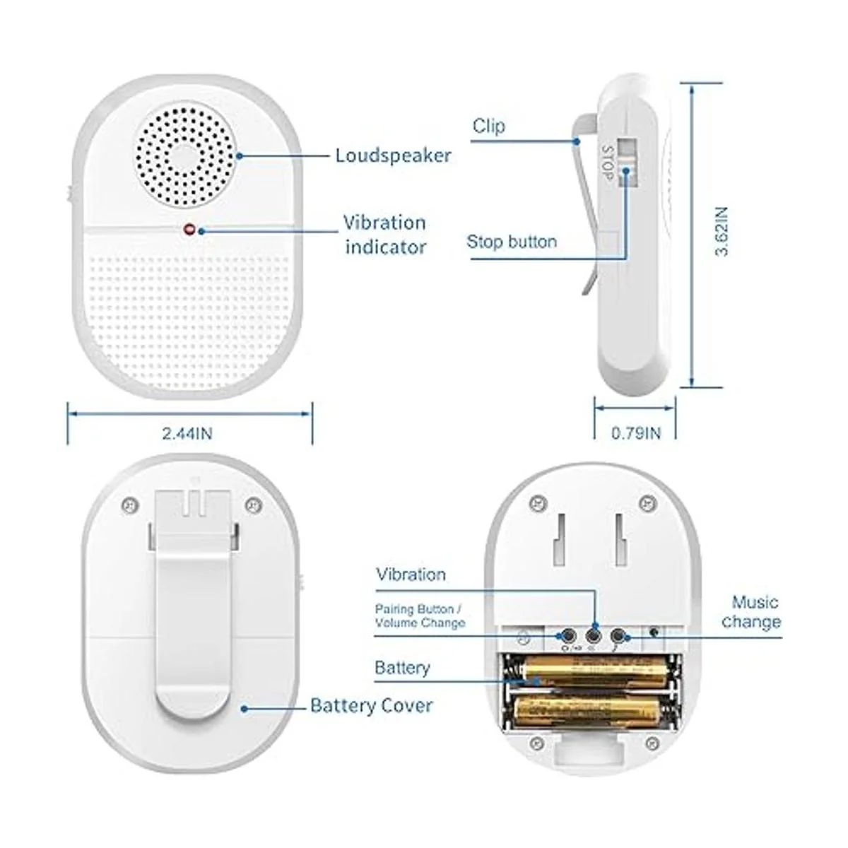Portátil con recordatorio de vibración: el receptor de batería es portátil, llévalo contigo a todas partes manteniéndolo en el bolsillo/bolsa o fijarlo con el clip de cinturón incluido. No requiere tarifas adicionales. El sistema de alerta sonará y vibrará y parpadeará cuando presiones el botón de llamada