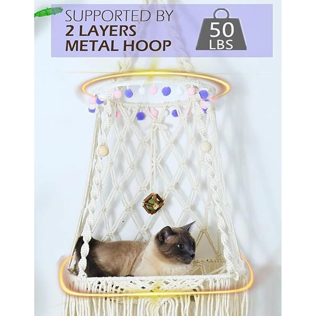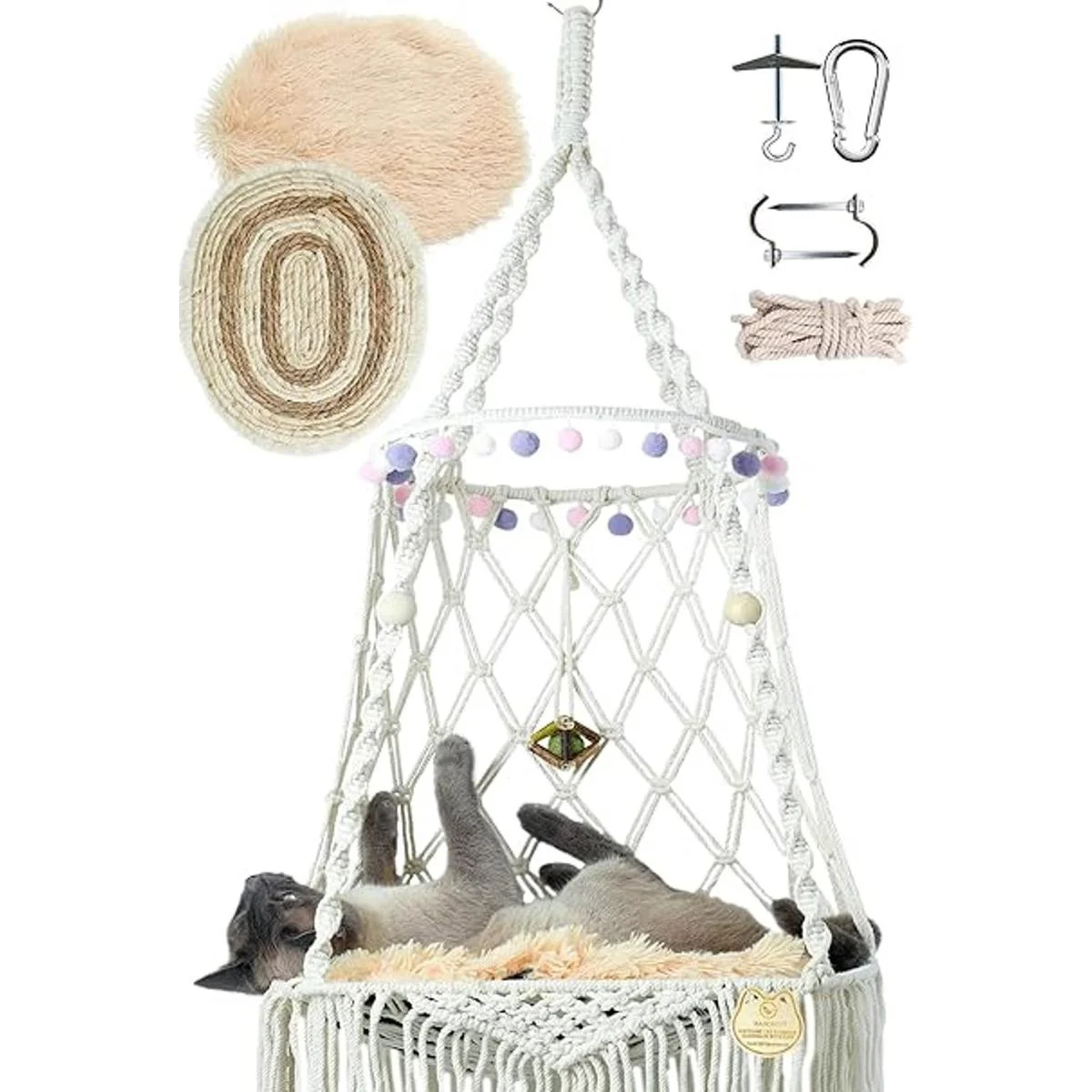 Cama hamaca colgante para gato, 9 piezas de macramé para gatos, cama colgante para gato, con 2 alfombrillas de hierba gatera