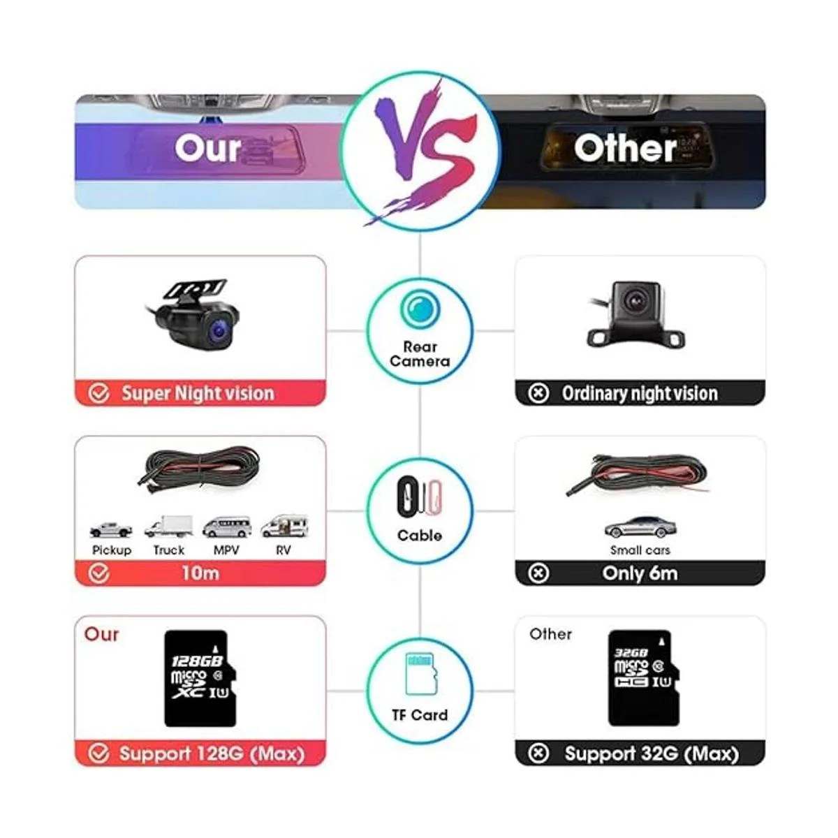 Cámara frontal y trasera dual de 1080P y cable de cámara de 33 pies de largo: la cámara frontal de 1080P y la cámara trasera Sony IMX impermeable de 1080P utilizan tecnología de transmisión de alta definición, la cámara de salpicadero de espejo puede proporcionar video ultra claro y capturar placas de matrícula desde la distancia. La cámara del espejo retrovisor es de lente gran angular que reduce los puntos ciegos para capturar muchos detalles en la carretera y está equipada con un cable único de cámara de visión trasera de 33 pies, te ayuda a resolver el problema del cable de la cámara corta cuando la instalación.