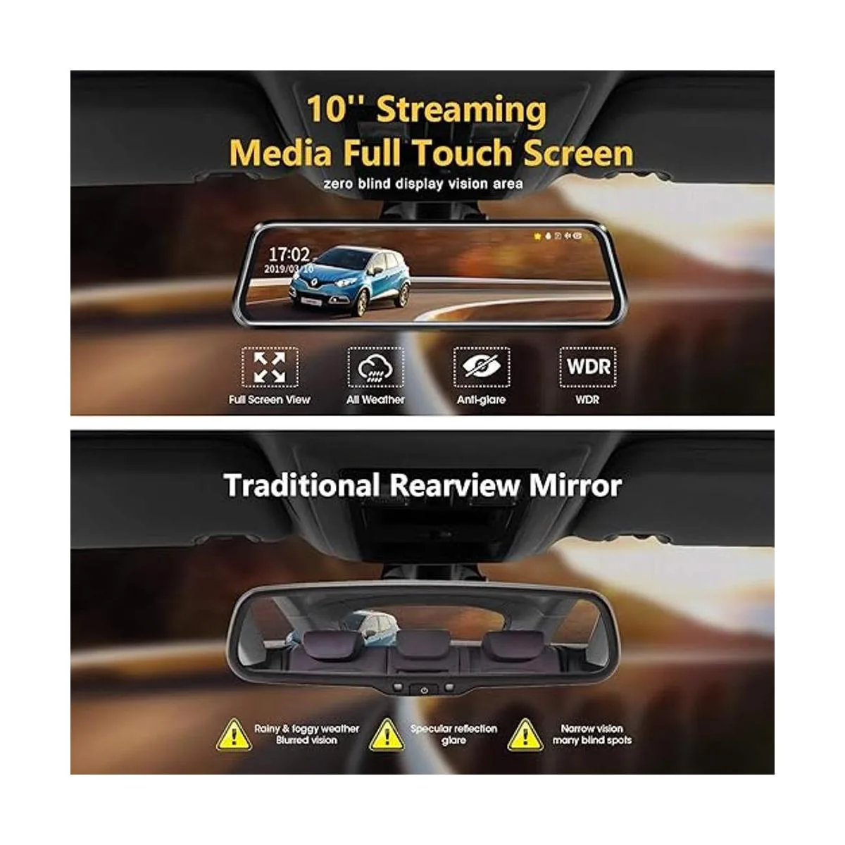 Cámara de espejo de 10 pulgadas, visión nocturna, 1080P FHD pantalla táctil completa frontal y trasera, cámara de respaldo para coches, grabación de bucle, medios de transmisión, asistencia de estacionamiento gran angular de 170 con cable de 32.8 ft