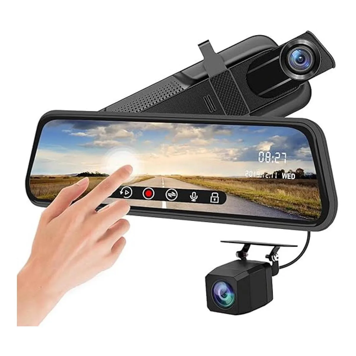 Cámara de respaldo de 10 pulgadas, cámara de tablero con espejo de doble lente frontal y trasera 1080P, pantalla táctil completa, transmisión de video, grabación de bucle de espejo retrovisor, monitor de estacionamiento, visión nocturna, cámara trasera impermeable
