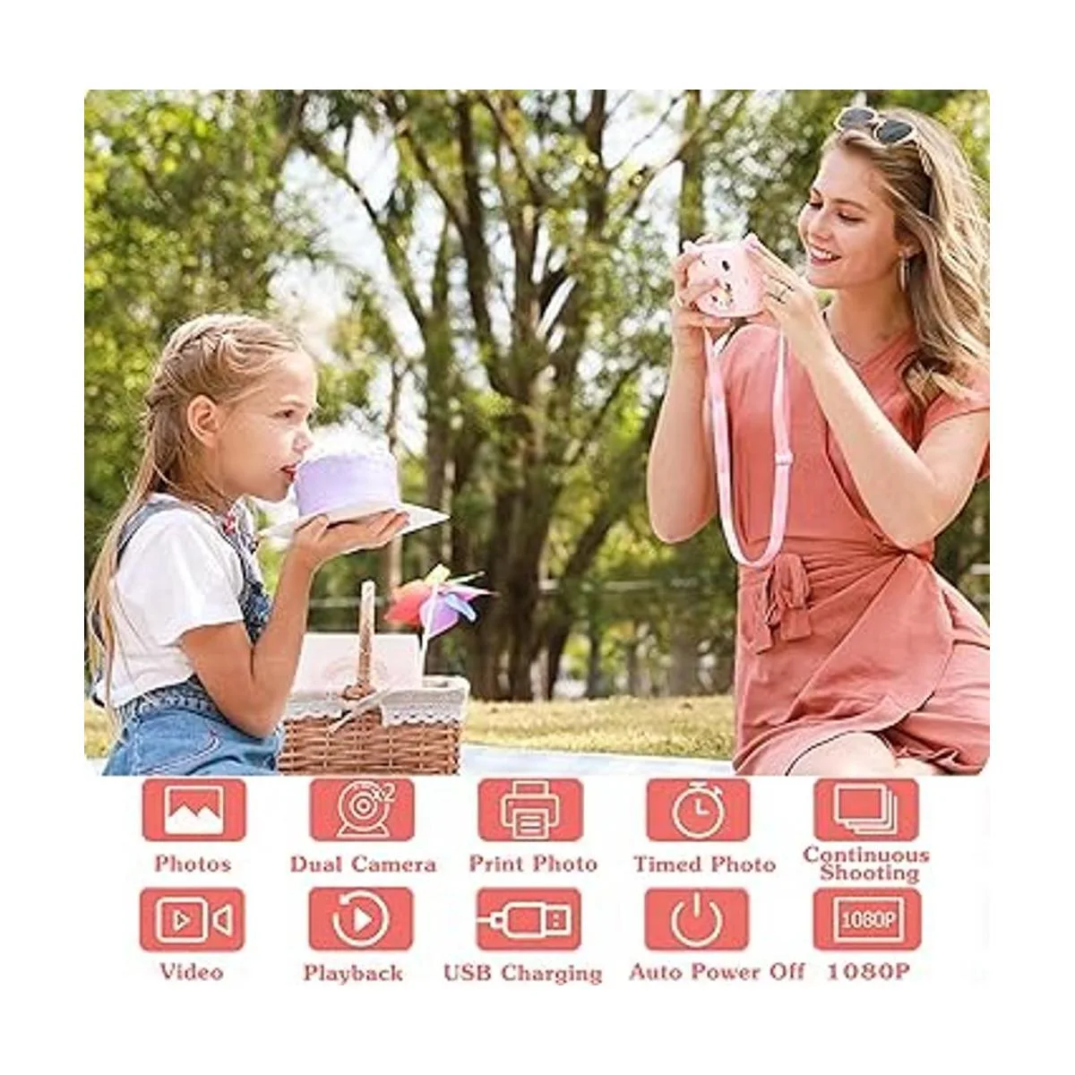 Potente: esta cámara para niños es versátil y fácil de operar, pantalla de 2.4 pulgadas, cámaras delanteras y traseras duales, grabación de video HD de 720/1080p, reproducción de video, disparo de retardo de 3 segundos, 3 disparos continuos, 7 marcos de fotos de dibujos animados, carga USB, batería de 1500 MA, duración de la batería para 23 horas, tarjeta TF de 32 GB.