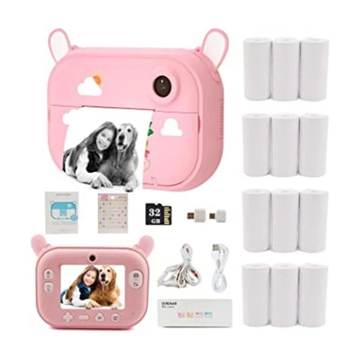 El paquete incluye: 1 cámara de impresión para niños, 1 tarjeta TF de 32 GB, 12 rollos de papel de impresión, 1 cordón de dibujos animados, 2 adaptadores OTG, 1 cable de carga USB, 1 instrucciones de uso debido al transporte a largo plazo, la batería puede agotarse y no se puede encender. Esto es normal, carga la cámara antes de usarla