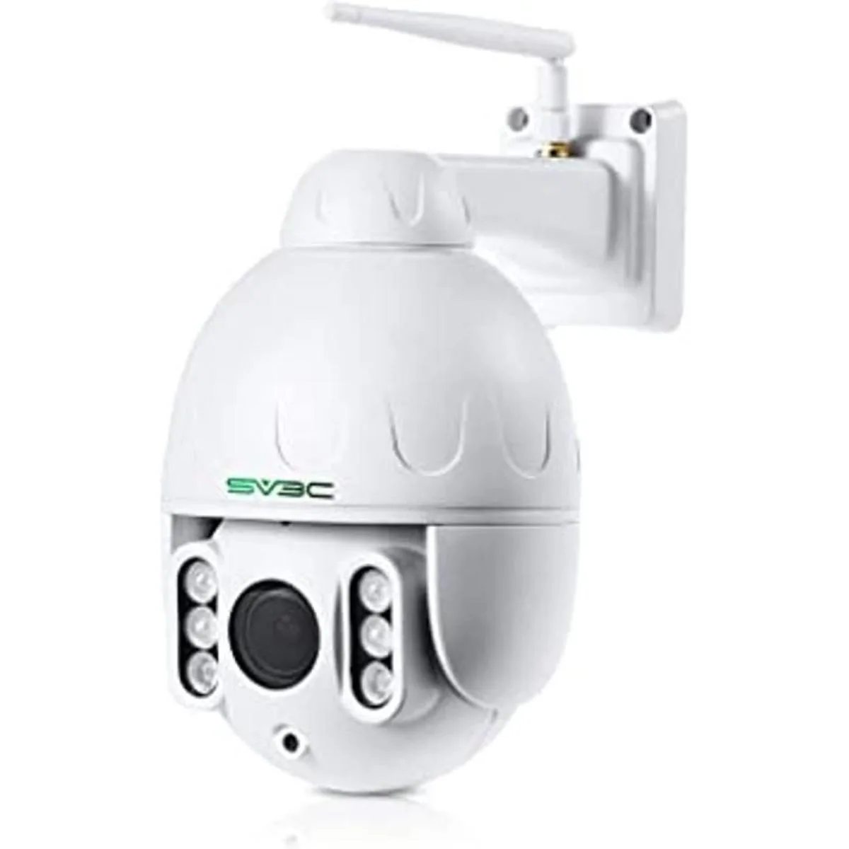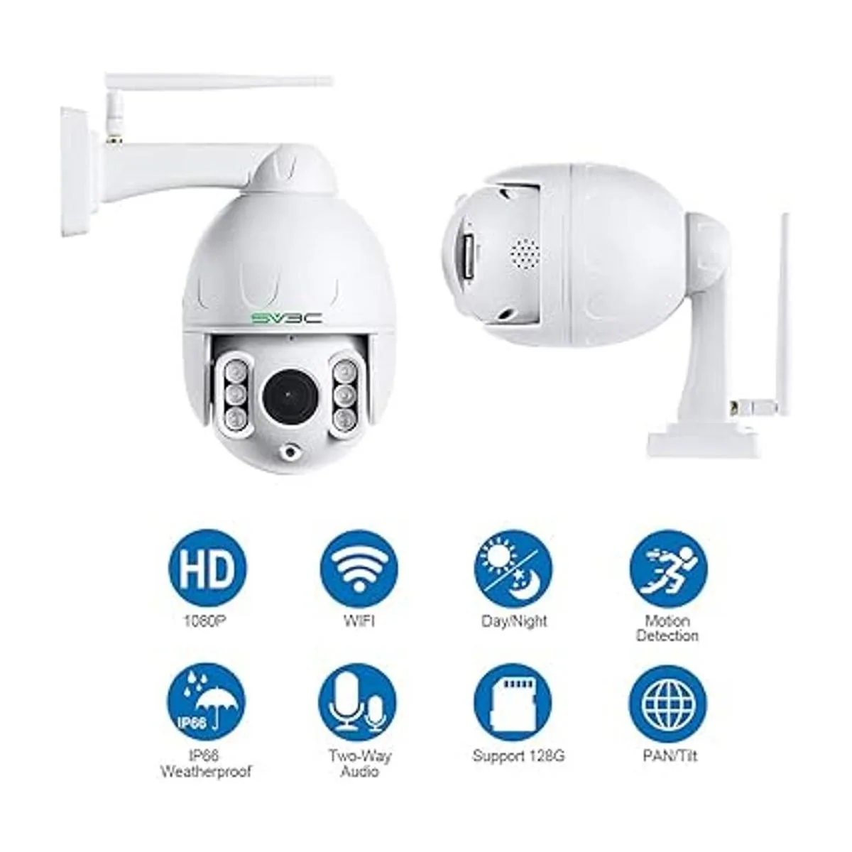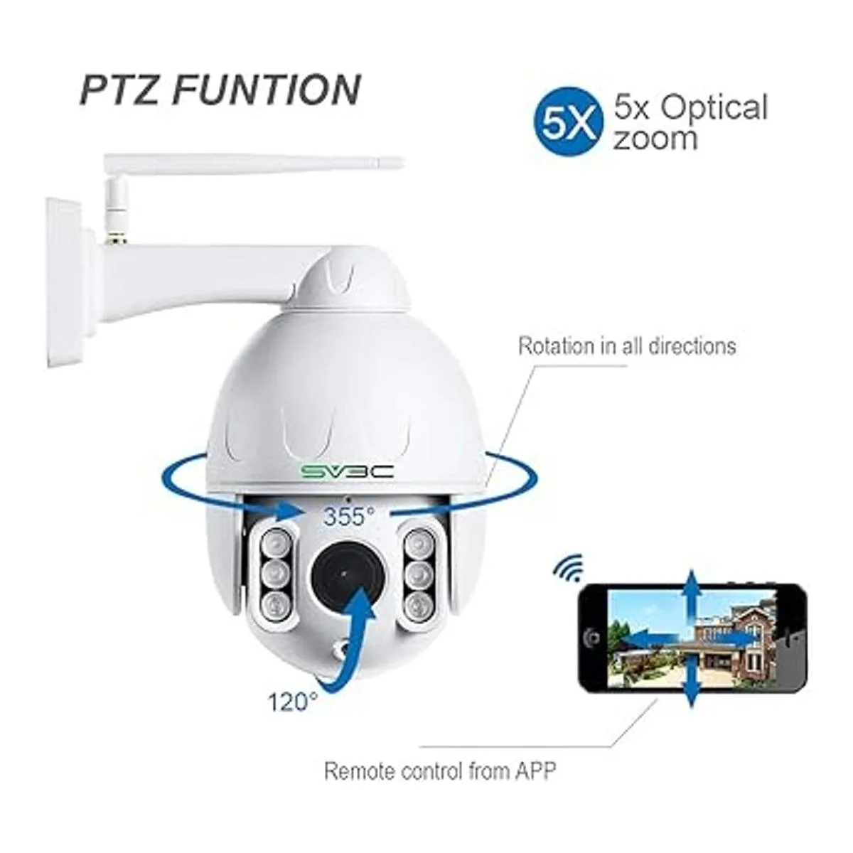 Cámara PTZ WiFi para exteriores, SV3C HD 1080P 5X cámara de movimiento IP con zoom óptico, 360 gran angular, visión nocturna IR HD de 197 pies, detección de movimiento humanoide, audio bidireccional, IP66 impermeable, RTSP, grabación de tarjeta SD 247