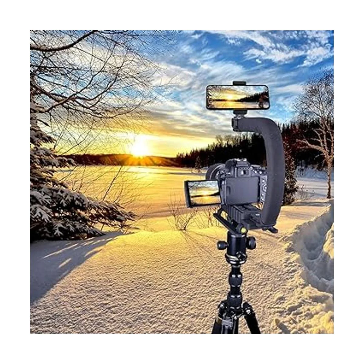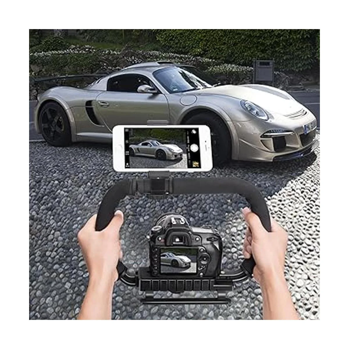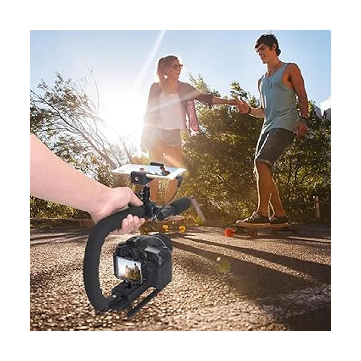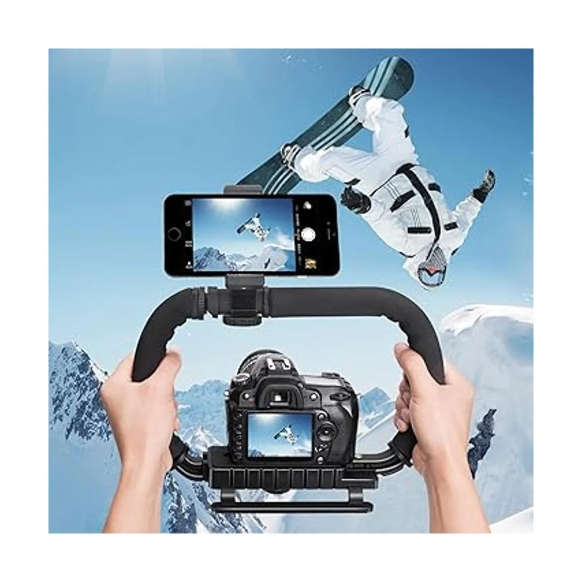El estabilizador fantástico de tercera generación, con diseño de soporte de 2 manos, te permite llevar una cámara DSLR pesada, que te ayuda a disparar de forma más estable. Sistema avanzado de disparo de ángulos bajos para todas las cámaras DSLR, DV, cámaras compactas, todas las cámaras de acción con una rosca estándar de 1/4 pulgadas. Aviso: cable OTG para teléfono Android no incluido.