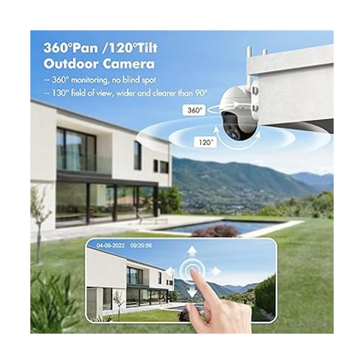 Pan/Inclinación de 360, zoom digital de 120, foco y sirena Las cámaras de seguridad inalámbricas para exteriores soportan la cabeza giratoria de 360 horizontalmente y rotación vertical de 120. Protege tu propiedad de forma más completa que el campo de visión de 90. Alarma de luz y alarma de sirena, maximiza la función de alarma de la cámara y repele a los intrusos a tiempo. La cámara de seguridad solar ZUMIMALL PTZ soporta un campo de visión de hasta 130 y zoom digital 4x, cubriendo cada esquina de forma más completa e intuitiva.