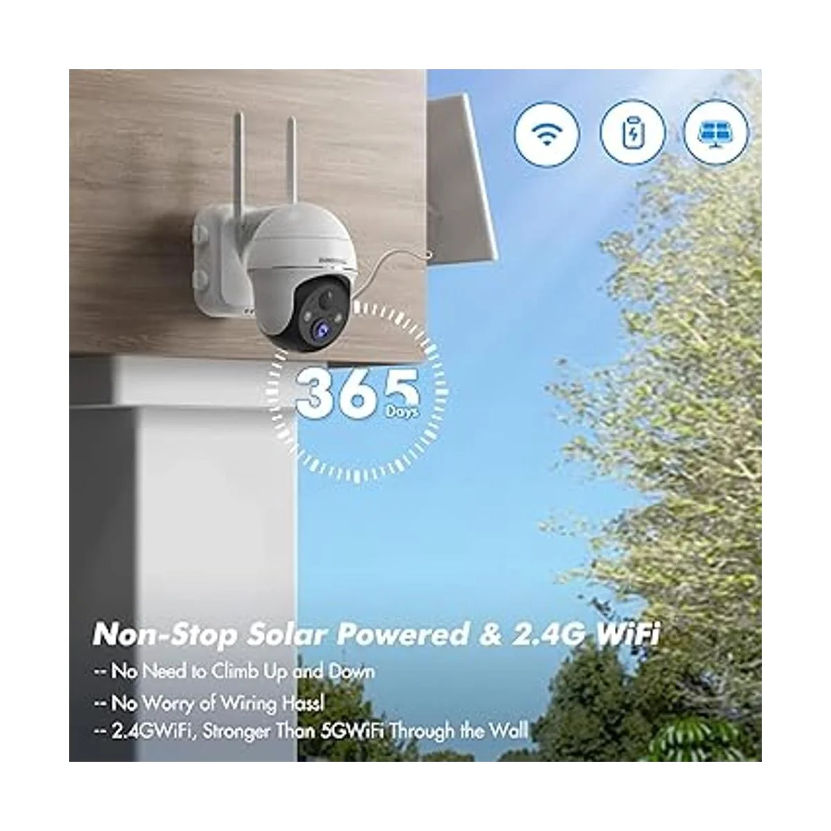 2 en 1 Funciona con batería/panel solar y 100 libre de inalámbricos Batería recargable mejorada de gran capacidad de 15000 mAh y panel solar ecológico de mayor eficiencia, cámara de seguridad de 360 al aire libre soporta 38 meses de tiempo de espera solo en la energía de la batería, además del panel solar puede lograr rápidamente una protección sin parar de 365 días. No hay problemas para subir y bajar para quitar la cámara. Antena dual 4dbi, 2.4GWiFi, conexión más estable, instalación 100 sin cables.