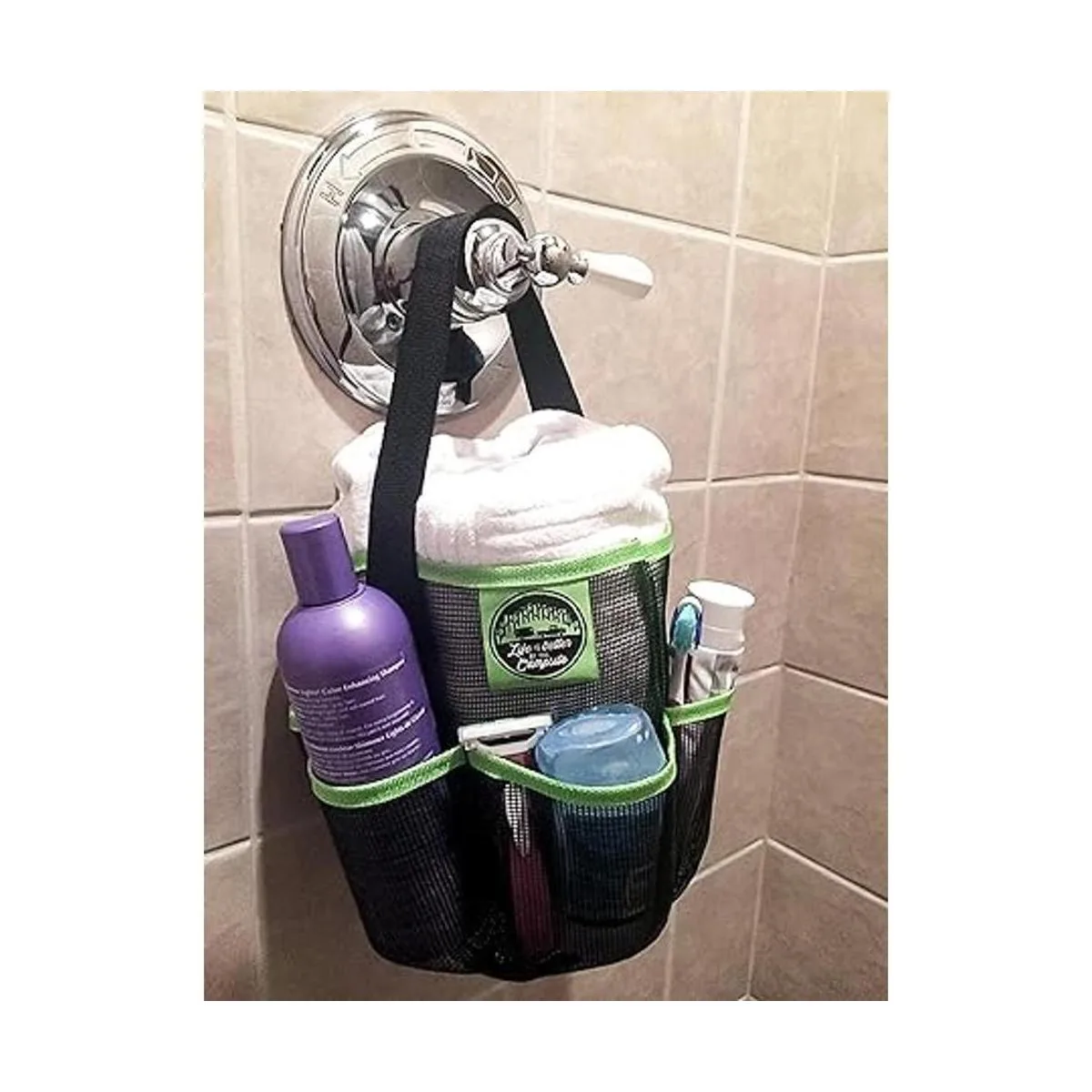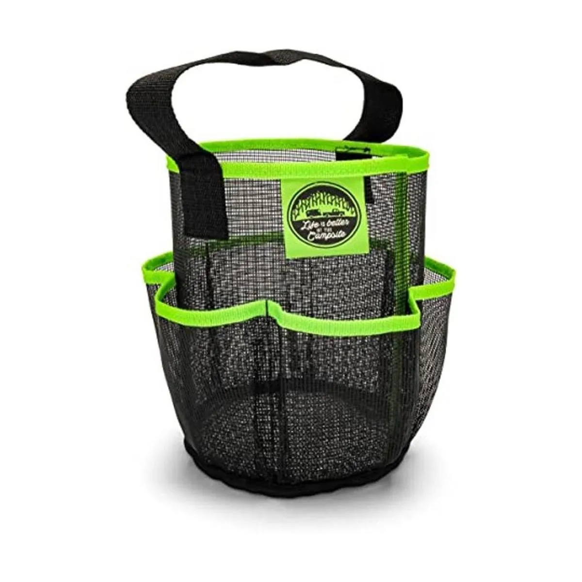 Camco Organizador de malla para ducha con bolsillos y asa de transporte, se seca rápido, perfecto para dormitorios, gimnasio, campamento, playa y viajes, organiza artículos de tocador y productos, color negro 51997