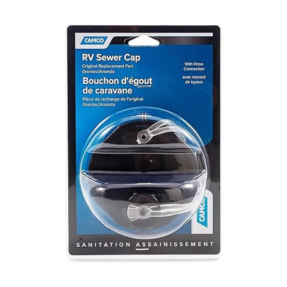Camco Tapa de alcantarillado duradera con conexión de manguera tapa la conexión de alcantarillado para evitar fugas, fácil instalación y uso sencillo 39463
