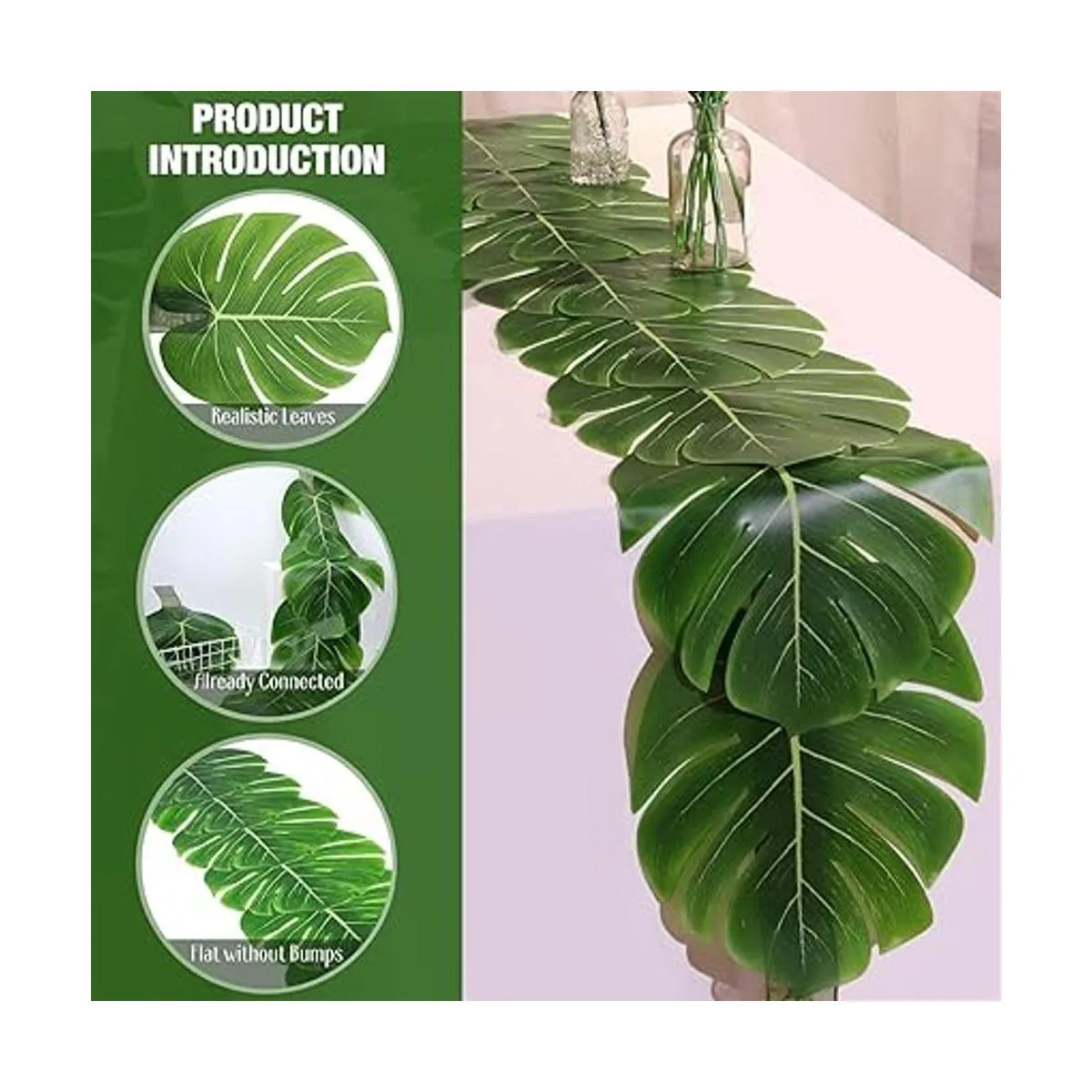 Mesas y sillas artificiales de hojas de palma: no son una hoja de palma tropical artificial; las hojas están conectadas entre sí para formar un camino de mesa; el tamaño de una sola hoja es de aproximadamente 13.8 x 11.4 in. La longitud de todo el mantel es de 72 pulgadas, lo que es muy adecuado para decoración de mesa temática tropical hawaiana