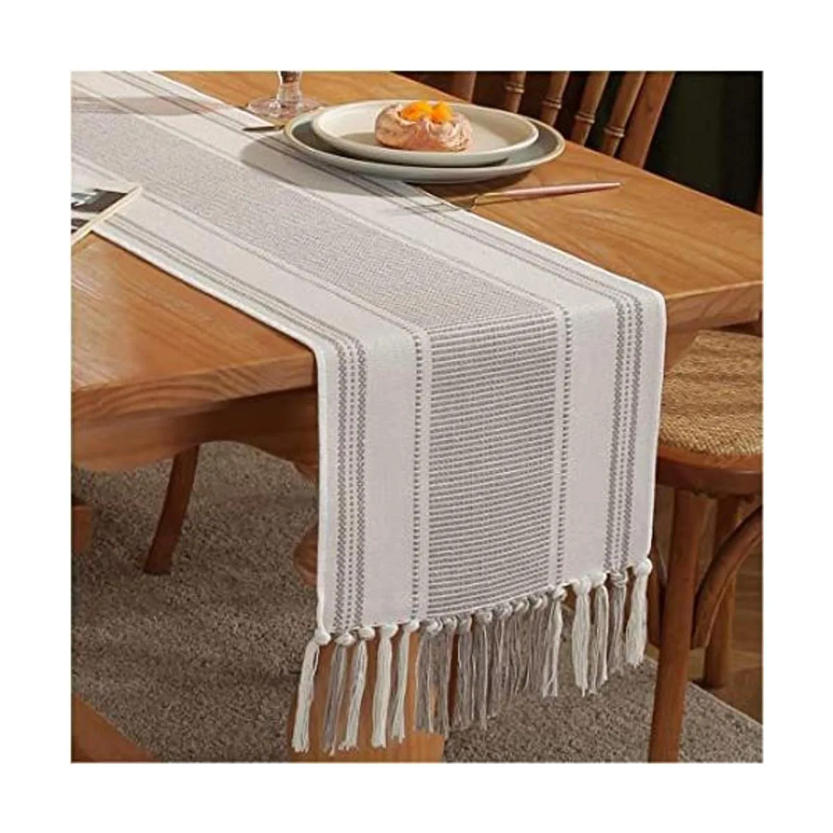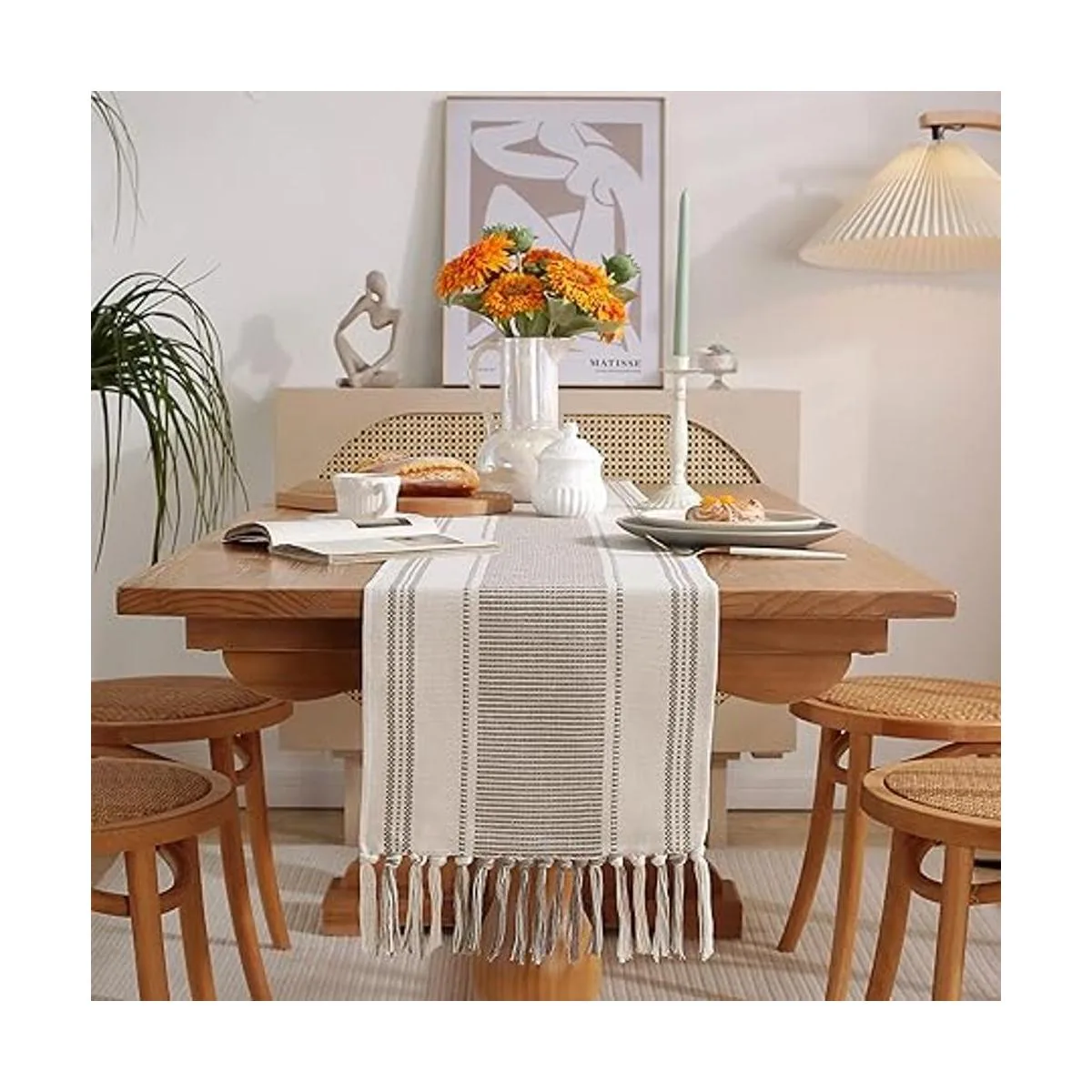 Camino de mesa bohemio a rayas naturales para decoración moderna de mesa de centro de granja, camino tejido rústico con borlas hechas a mano para decoración de mesa de comedor del hogar, 13 x 60 pulgadas de largo