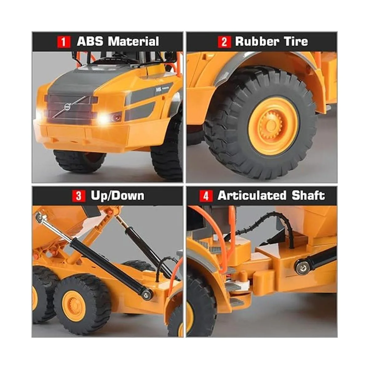 Camión volcador articulado: el eje articulado está diseñado para proporcionar una mayor descarga, con más de 60 hacia arriba y hacia abajo de movimiento de trabajo, al igual que el verdadero para darles más diversión a los niños.