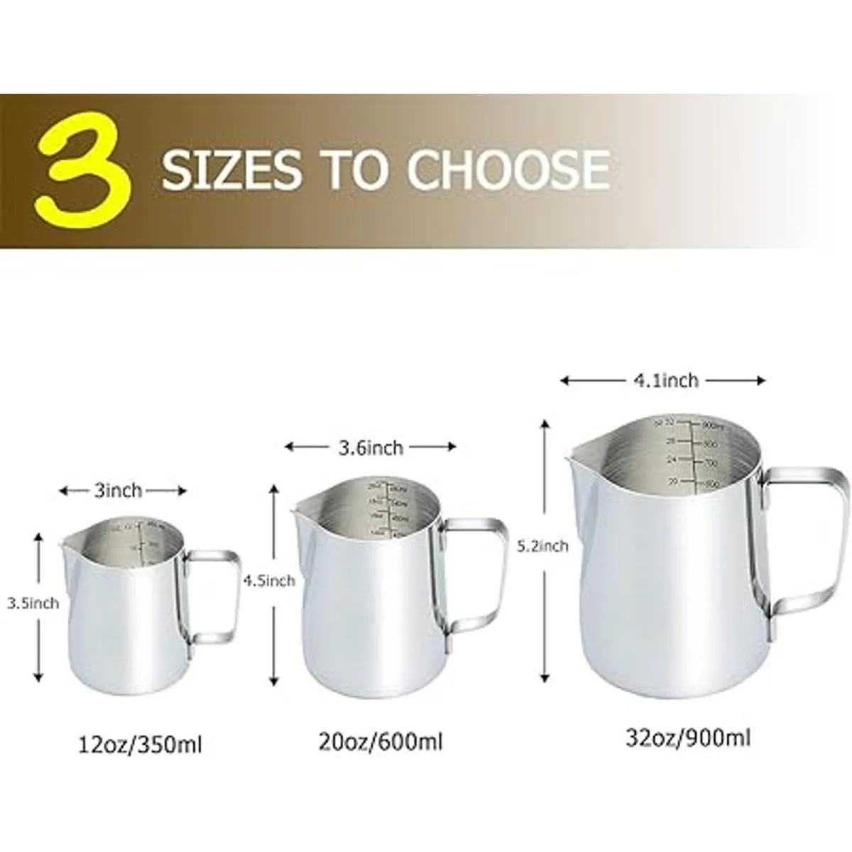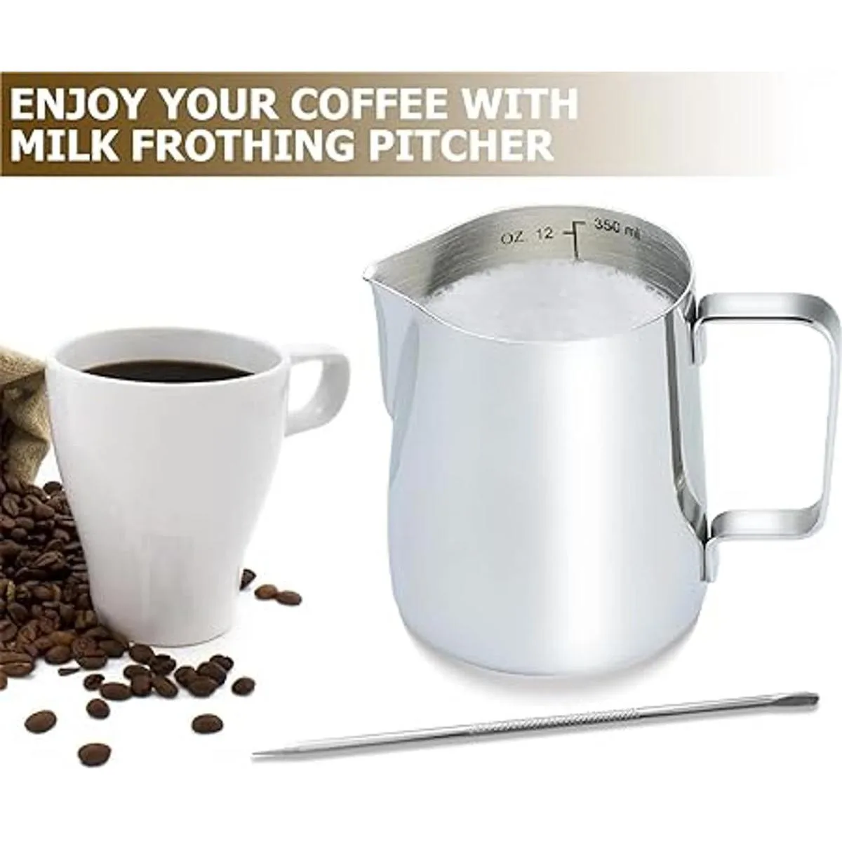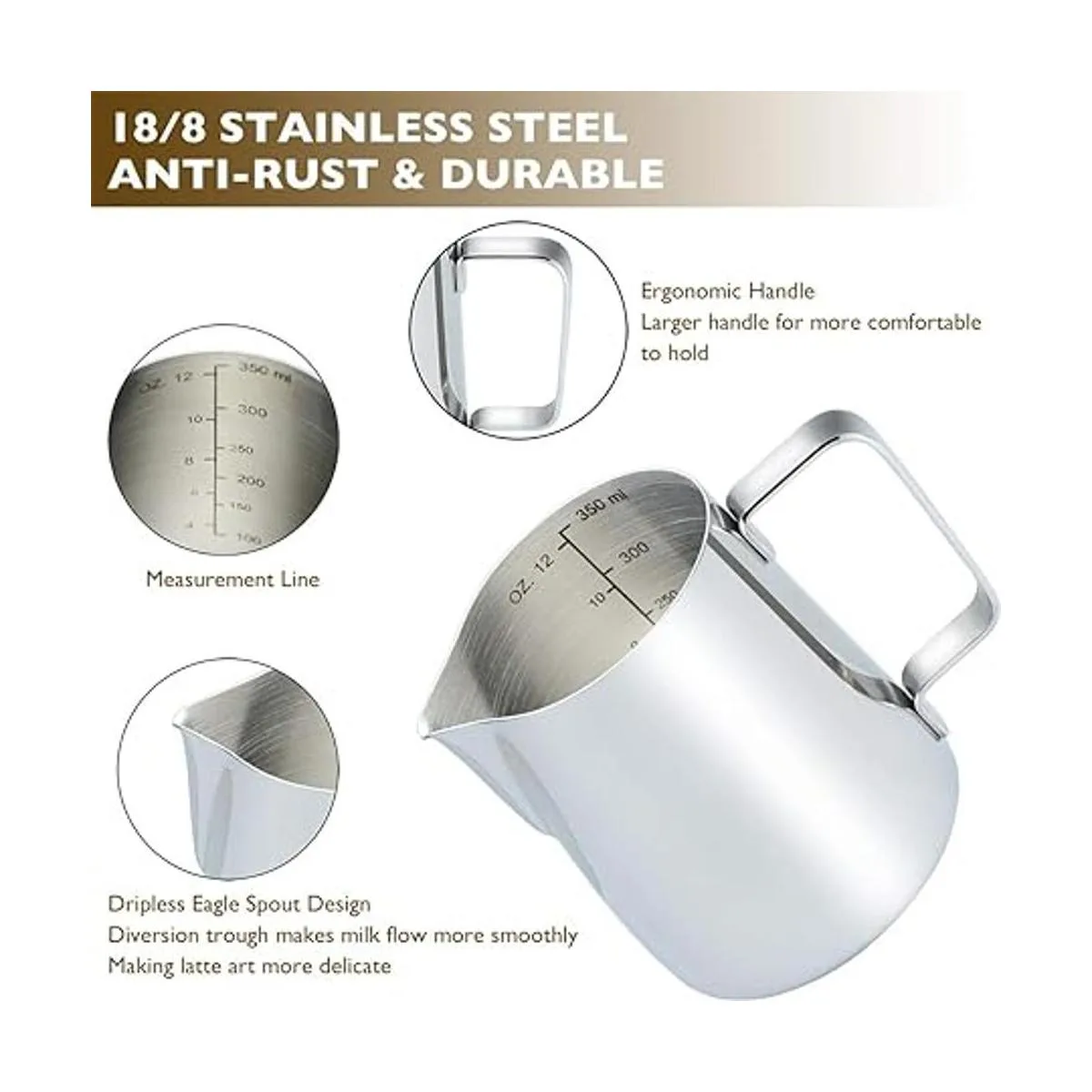 Para mejores bebidas, medidas en el interior. Colocamos medidas métricas y estadounidenses de hasta 11.8 fl oz justo en el interior de nuestra bonita jarra de espuma de leche. Es fácil de leer, tienes que prestar atención a los números para bebidas realmente deliciosas. salo con máquinas de café expreso, para vaporizar tu leche o crema para ser suave y sedosa con pocas burbujas, crea un arte de latte perfecto y personal para tu café o capuchino.