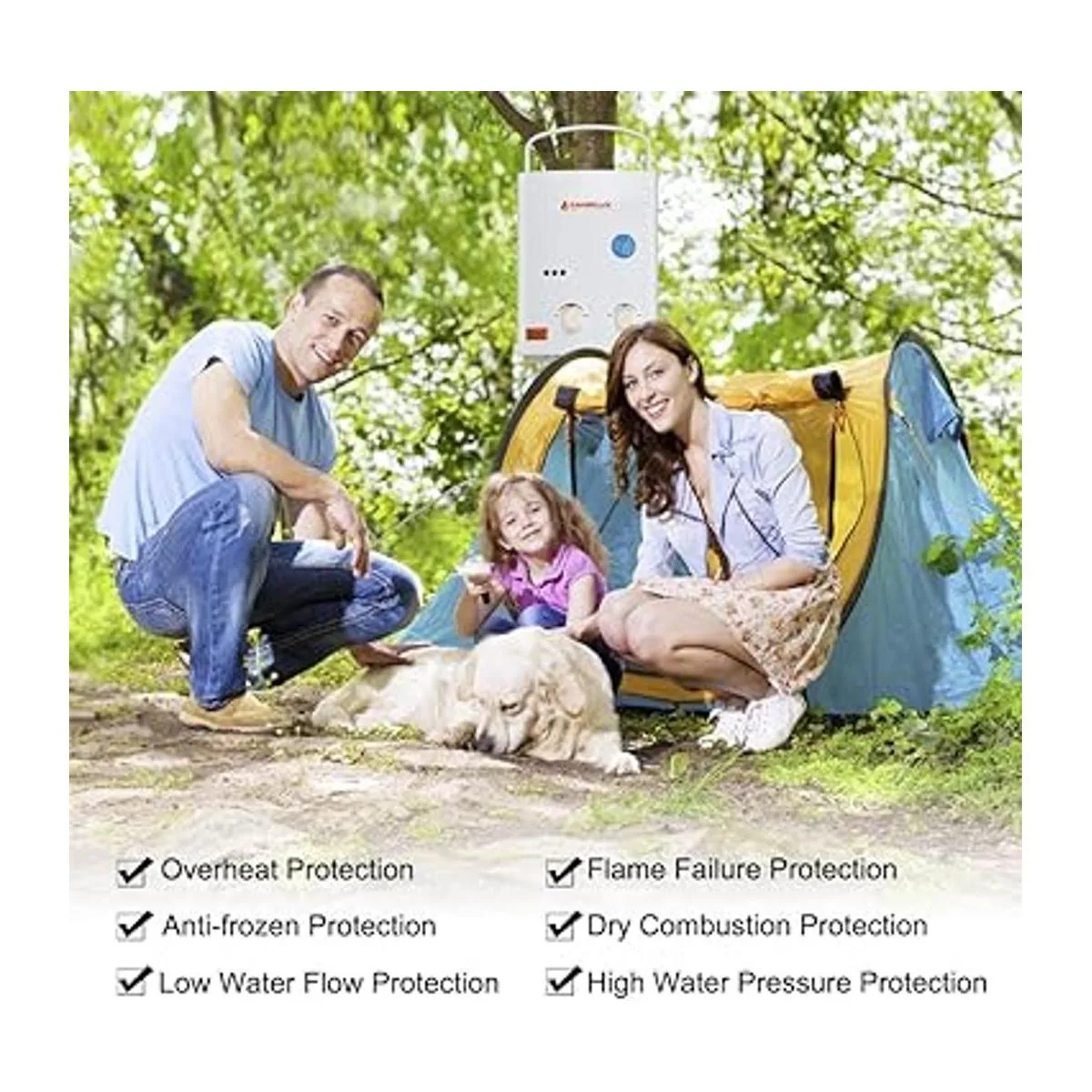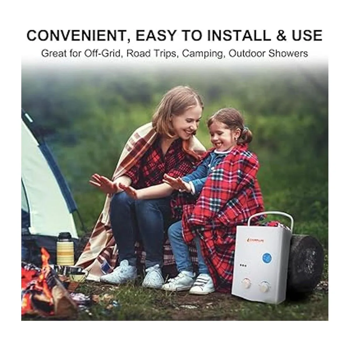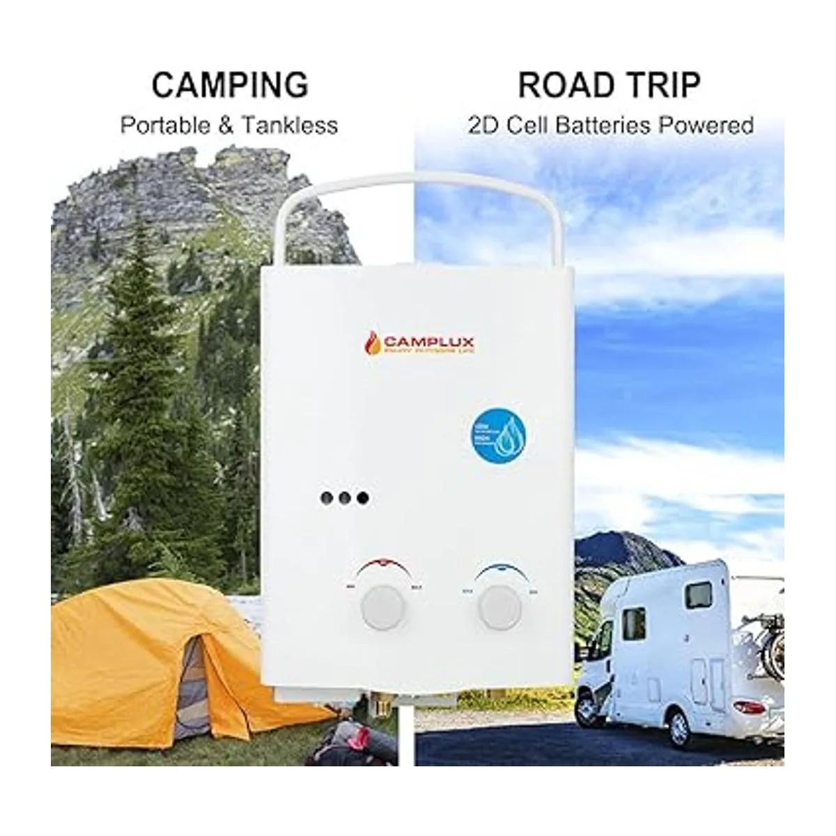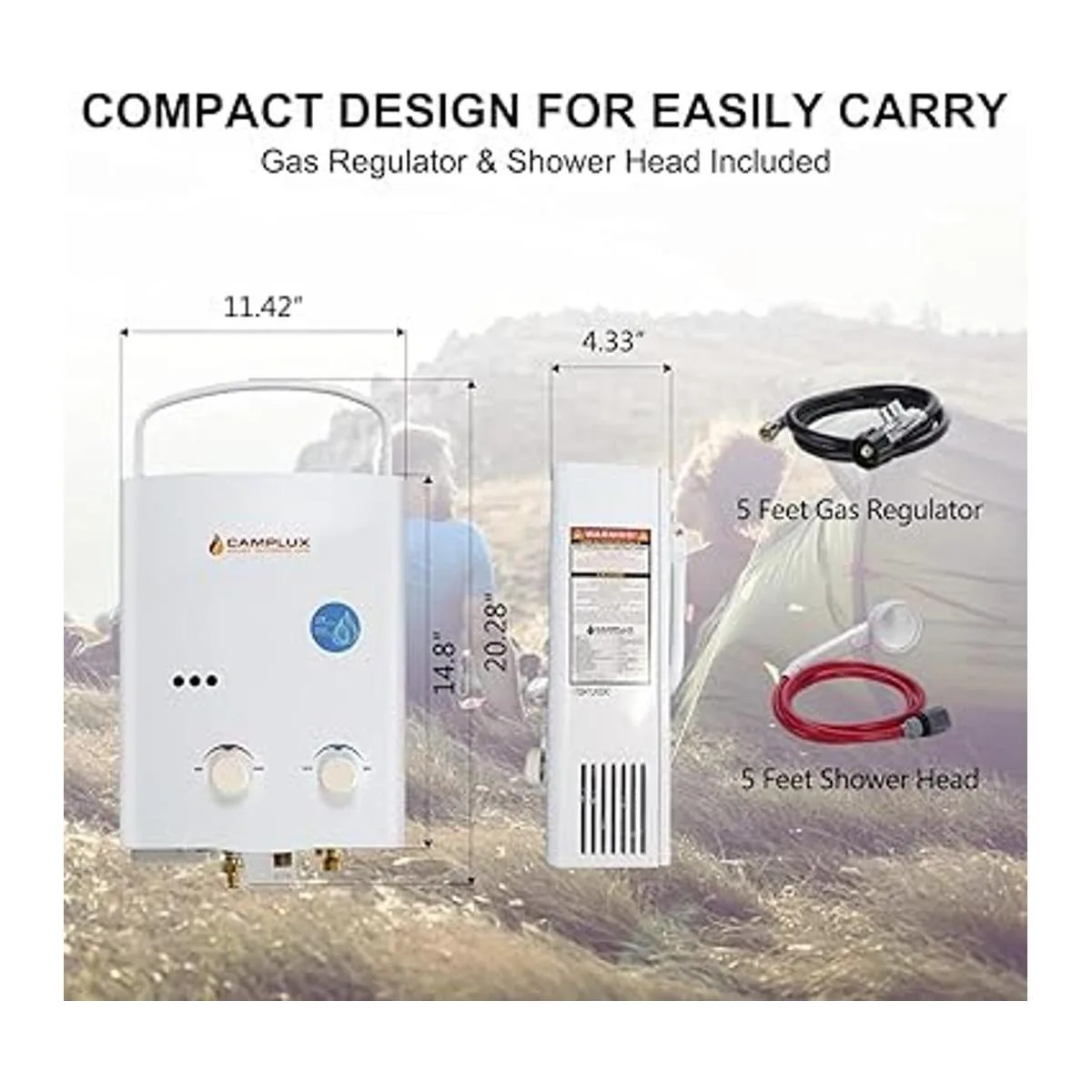 Camplux Calentador de agua portátil para exteriores de 5 litros, calentador de agua de gas propano sin tanque de 1.32 GPM para RV, campamento, graneros, color blanco