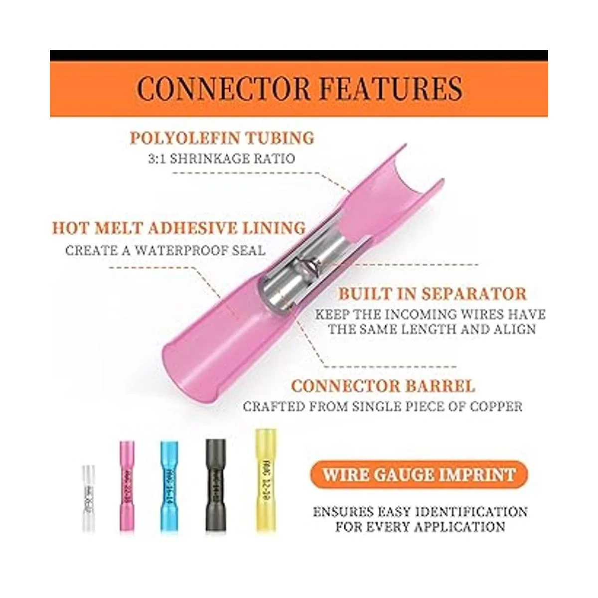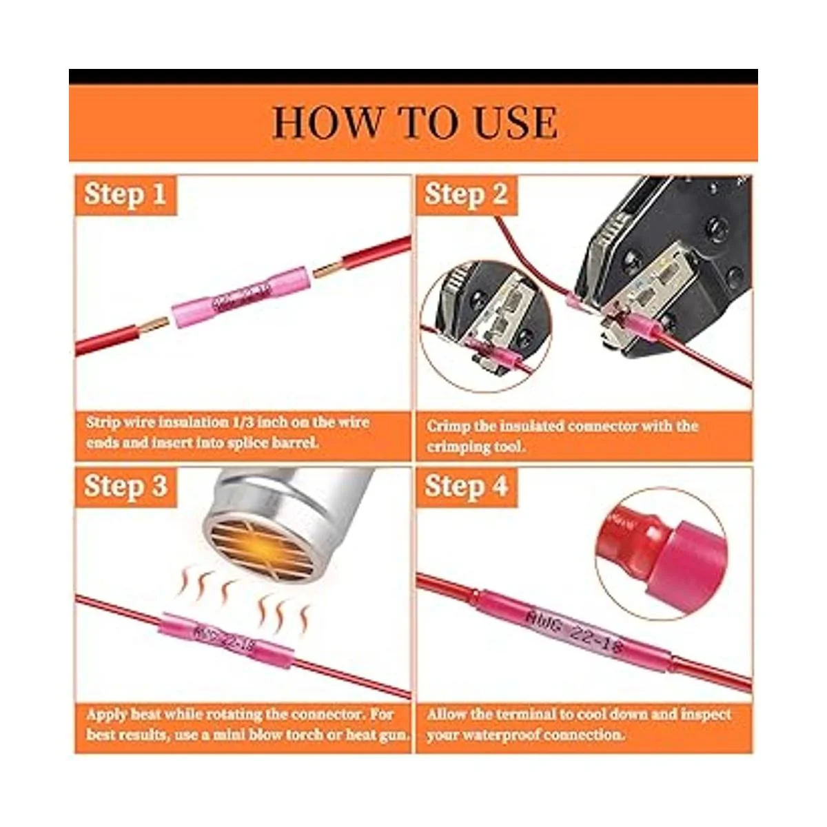 Paquete El kit de conectores de crimpado termorretráctil viene dentro de una funda reutilizable, fácil de almacenar y transportar. Este paquete incluye 525 conectores rojos impermeables que se pueden utilizar en cables AWG de 22 a 18.