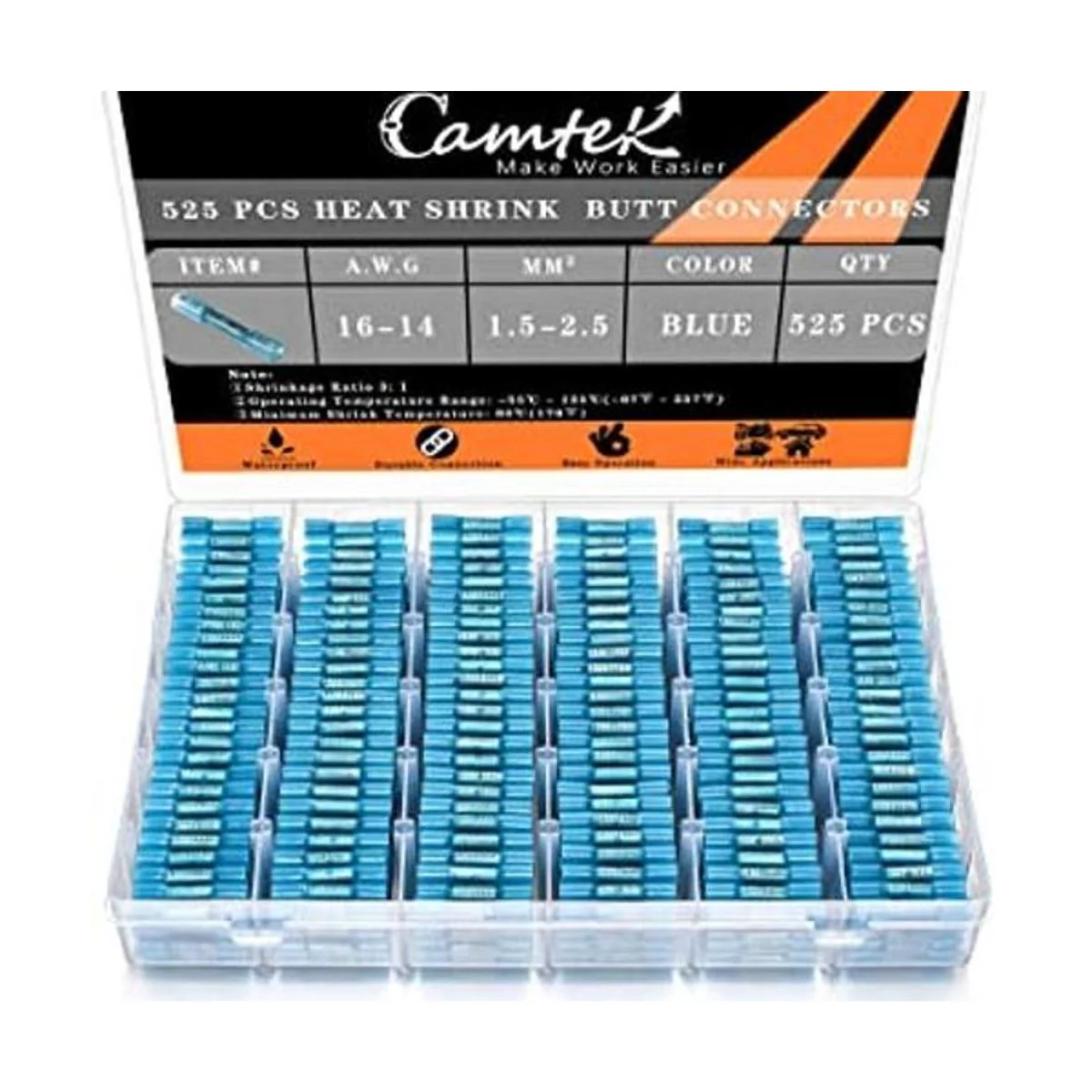 Camtek 525 terminales de conectores a tope termorretráctiles de 16 a 14 AWG, conectores de cable eléctrico impermeables, terminales de crimpado aislados, terminales de empalme a tope automotrices marinos, color azul