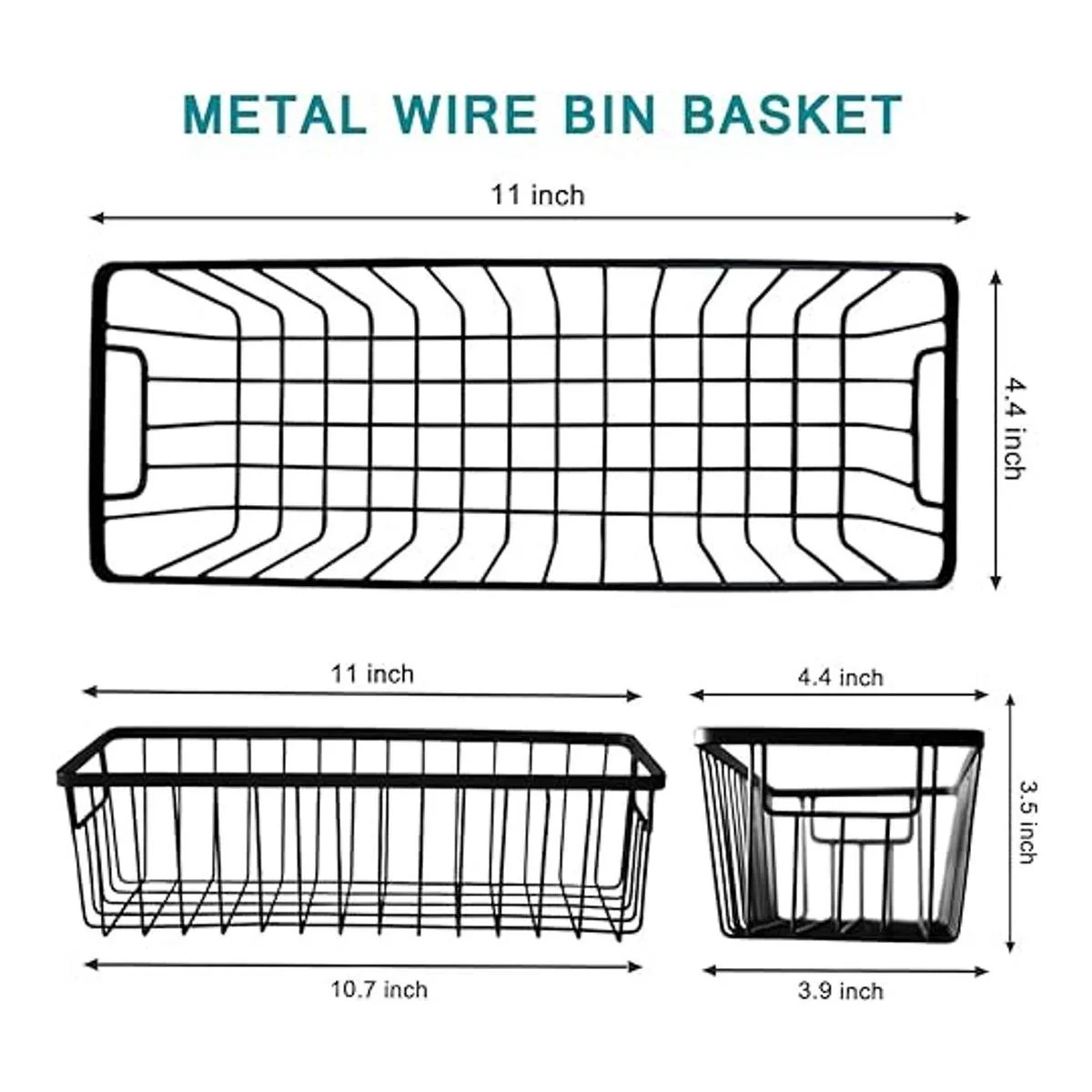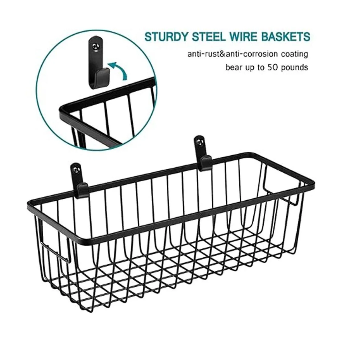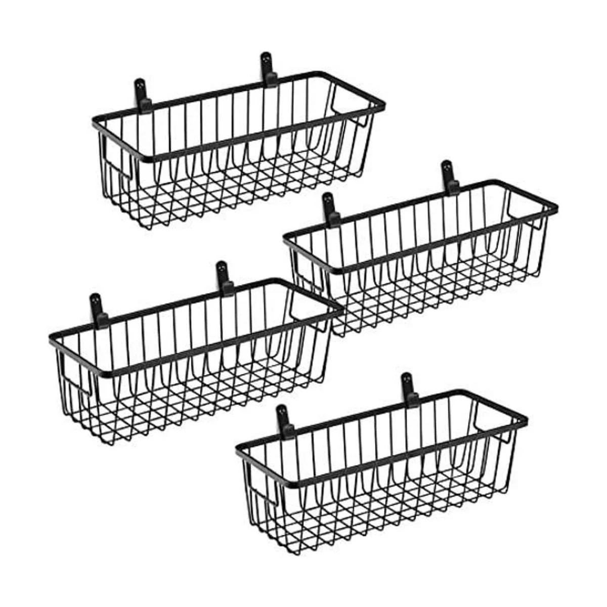 Canasta de alambre de metal para casa de campo con soporte de pared, pequeña, paquete de 4 unidades, cesta de pared colgante portátil, organizador de almacenamiento rústico para gabinetes, despensa, armarios, baño, cocina, dormitorio negro