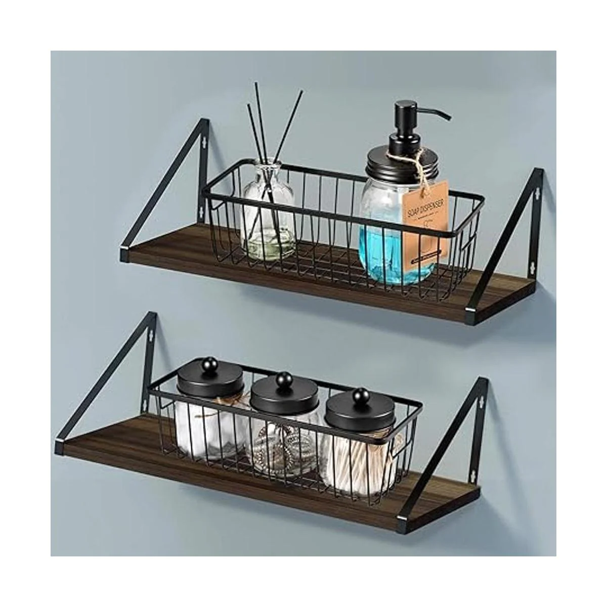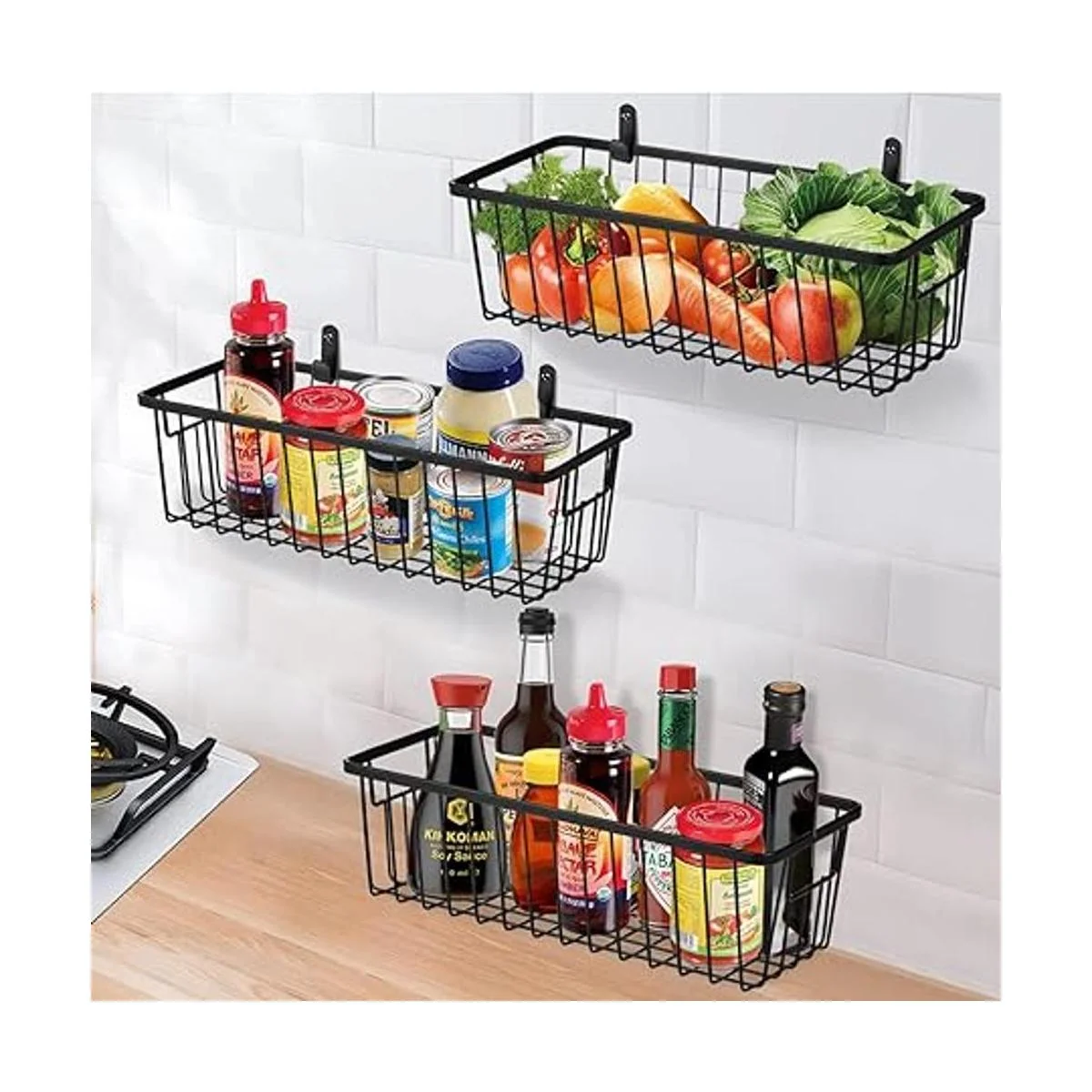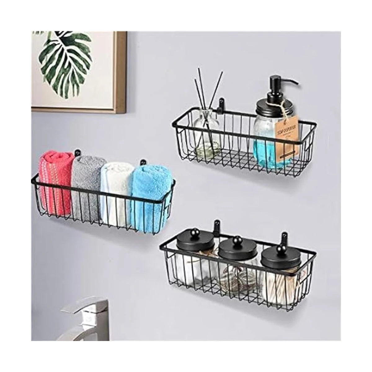 Canasta de alambre de metal para casa de campo con soporte de pared, pequeña, paquete de 4 unidades, cesta de pared colgante portátil, organizador de almacenamiento rústico para gabinetes, despensa, armarios, baño, cocina, dormitorio negro