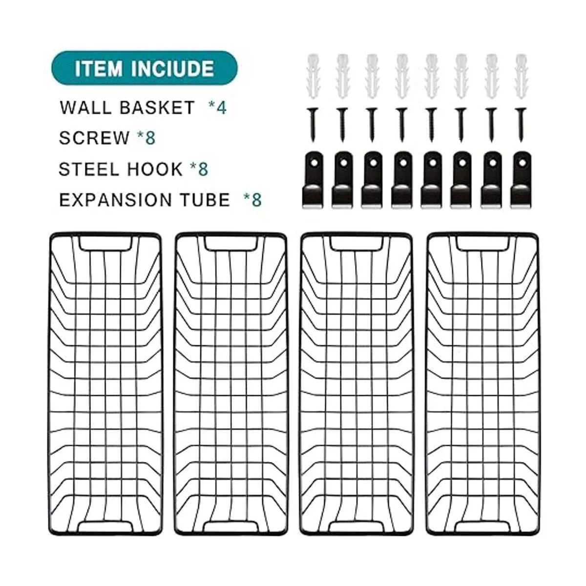 El artículo incluye: 4 cestas de alambre con juego de accesorios de montaje 8 ganchos de acero 8 tubos de expansión 8 tornillos. Cada cesta mide 11 x 4.3 x 3.6 pulgadas de alto. Si tienes alguna insatisfacción con nuestros productos, por favor ponte en contacto con nosotros y te ofreceremos una solución satisfactoria en 24 horas