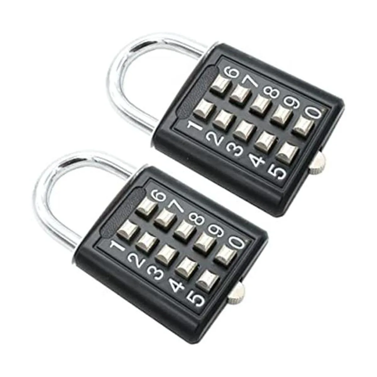2 candados de combinación de botón de seguridad de 10 dígitos. Mecanismo de bloqueo de 5 dígitos el número preestablecido aleatorio no se puede reparar. Usos: puertas de patio, valla de piscina, armario, taquilla de gimnasio, caja de seguridad. Apto para niños y ancianos debido a la facilidad de uso