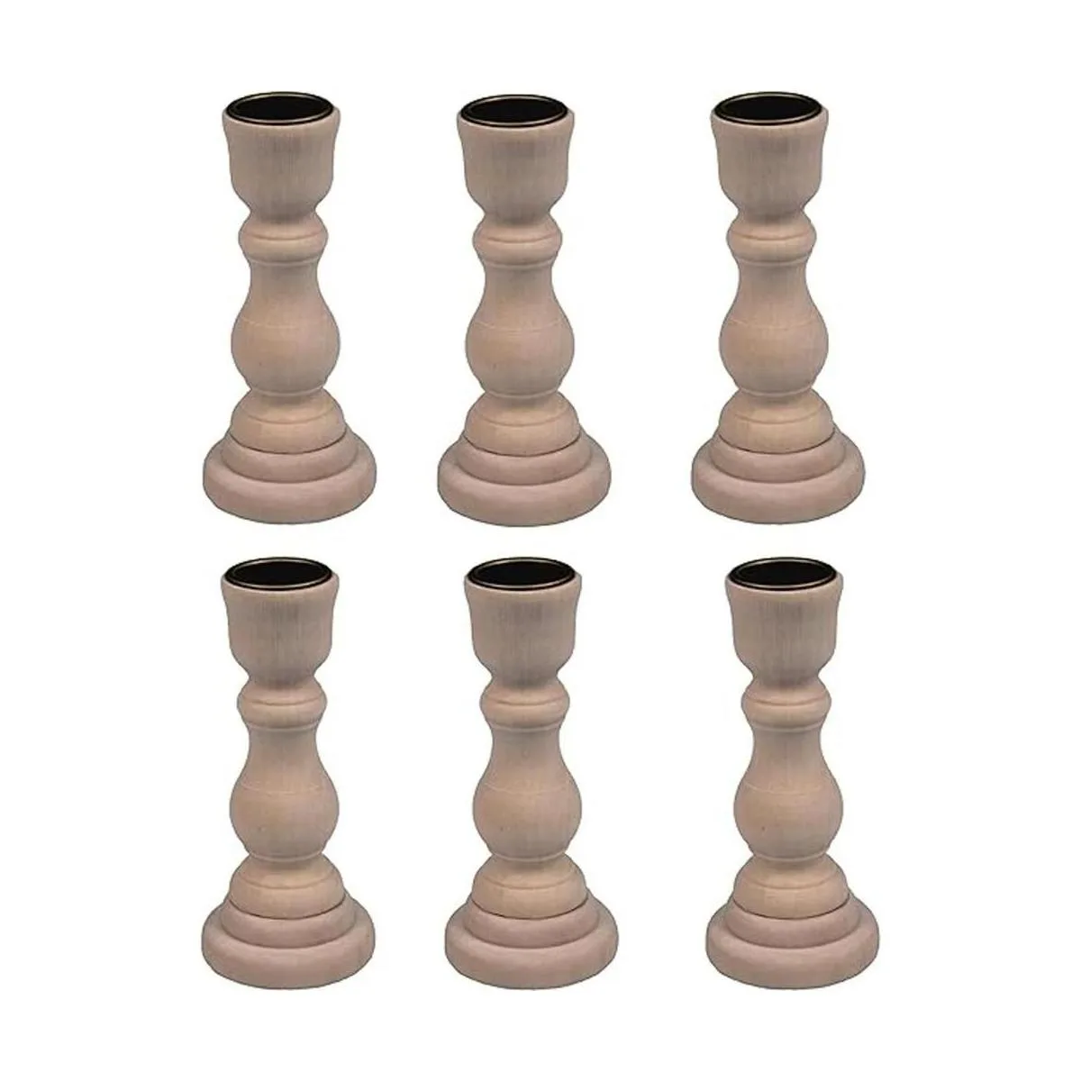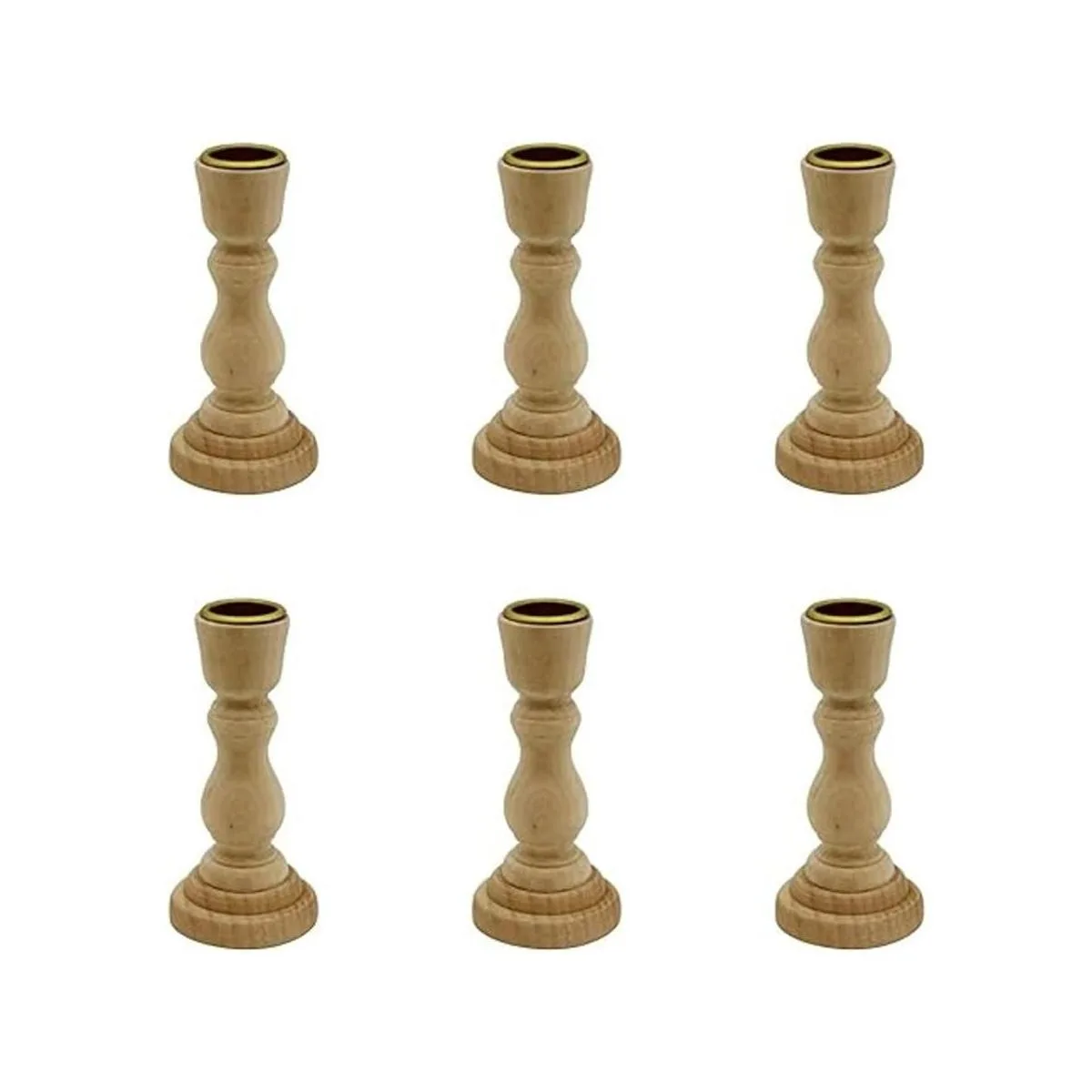 Valor: paquete de 6 portavelas de madera sin terminar, cada uno mide 4 pulgadas de alto x 1.75 pulgadas de ancho.