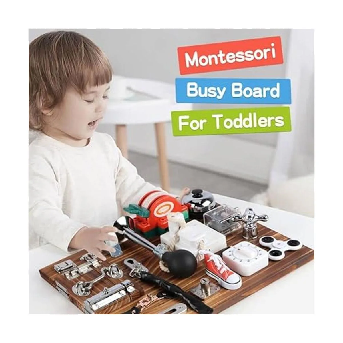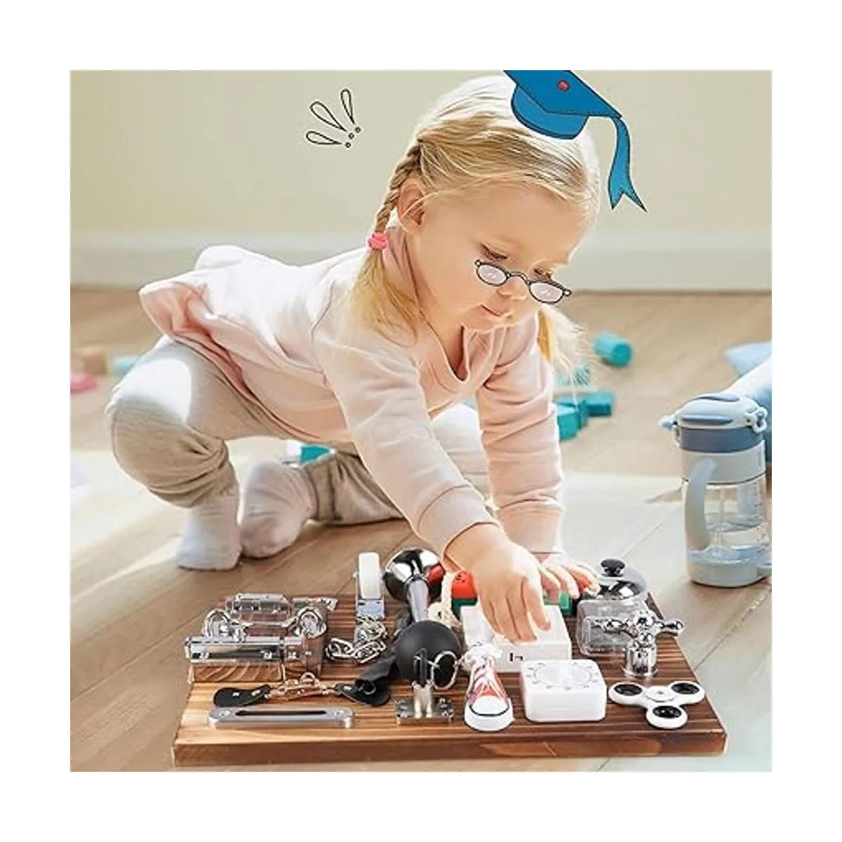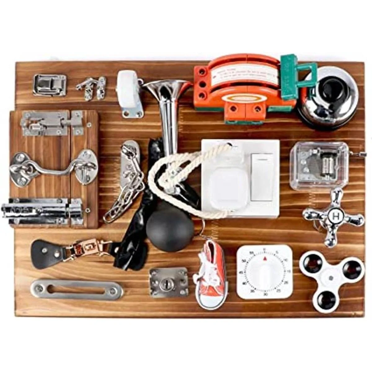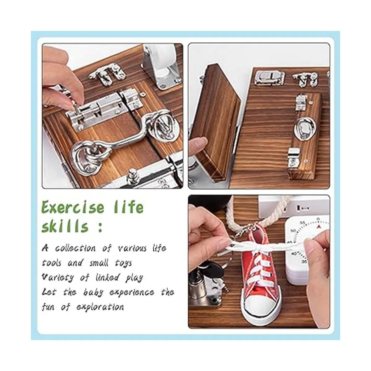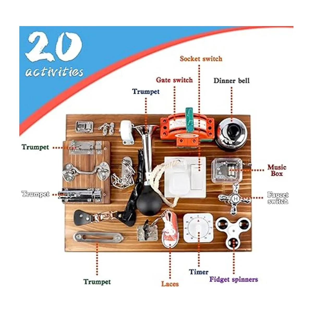 Juego de múltiples actividades: encuentra diferentes actividades en 1 tabla ocupada, incluyendo cremalleras, cinturones, castañuelas, interruptores, campanas, cordones, enchufes, hebillas de metal, cerraduras y más, diseñado para que los niños jueguen y aprendan.
