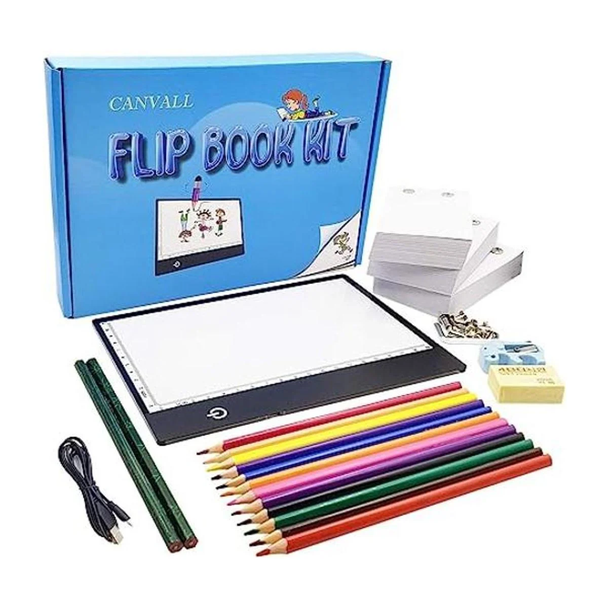 Canvall Juego de Flipbook para dibujo y trazado de animación, incluye caja de luz LED A5, 540 páginas, papel de hoja suelta animado, 2 HB 12 lápices de dibujo de colores, sacapuntas, borrador y destornillador