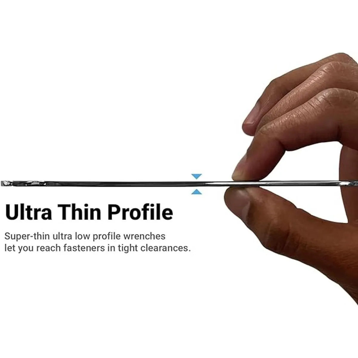 Las llaves superfinas de perfil ultra bajo te permiten llegar a los sujetadores en un espacio reducido. Solo 0.181 in de grosor y fabricadas con acero forjado de alta calidad, estas llaves de extremo abierto superfinas son realmente versátiles y están hechas para durar