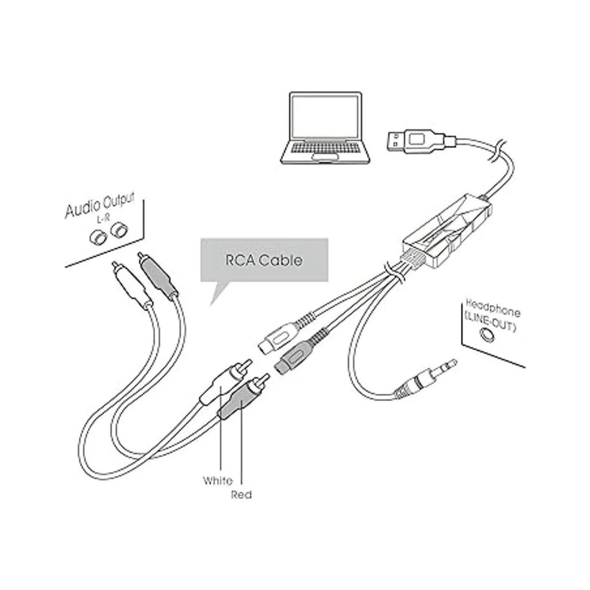Conector de audio de 3,5 mm y de r/l de entrada de audio, USB a PC, grabación en computadora y convertir en MP3/WAV