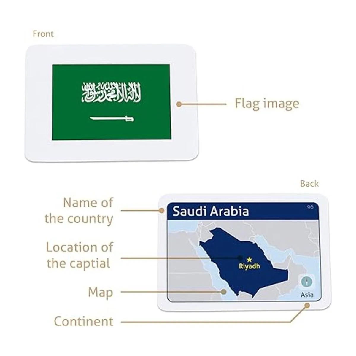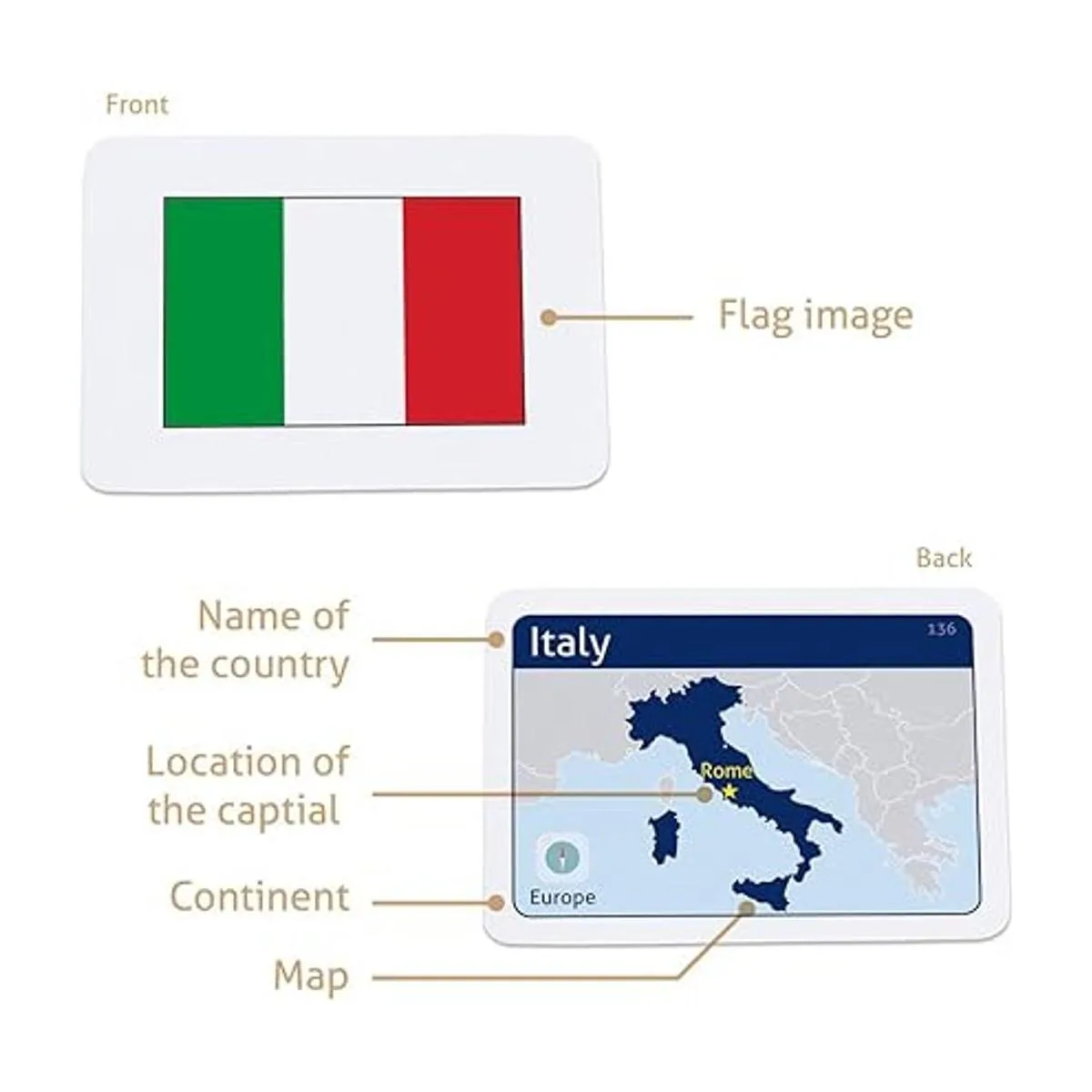 Informativo: un lado muestra una bandera de país a todo color, el otro lado muestra el nombre, el mapa del país, el continente al que pertenece y la posición de su ciudad capital. La edición 2021 tiene la información más actualizada sobre nuevos países como Macedonia del Norte, Sudán del Sur y Eswatini.