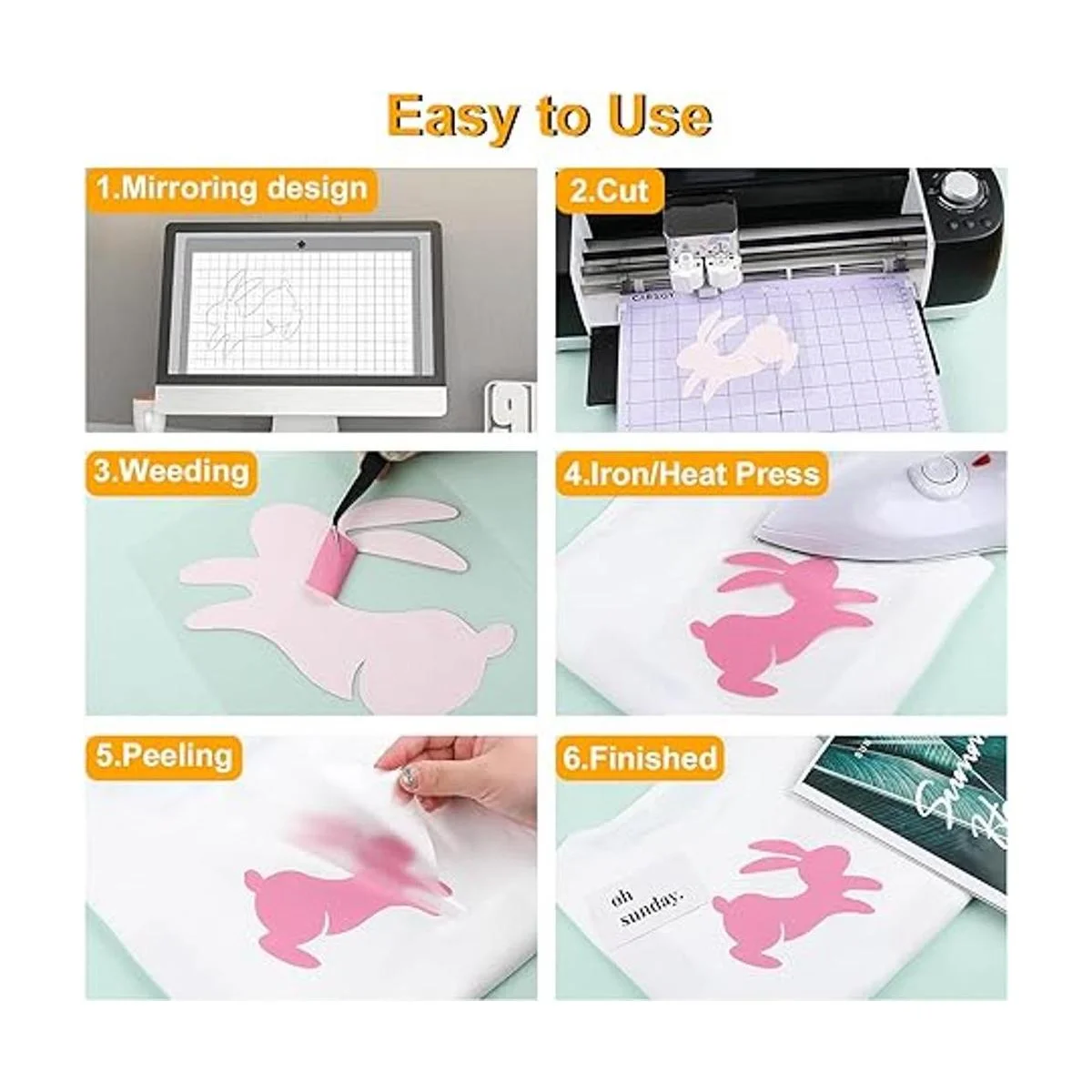 Fácil de cortar, eliminar restos y transferir: el paquete de vinilo de transferencia de calor HTV suave y suave es fácil de cortar y deshierbar, lo que es bueno para el principiante. Puede ser compatible con Silhouette Cameo, Cricut Maker, máquinas de prensa de calor, haciendo que el trabajo de transferencia de calor sea más fácil.