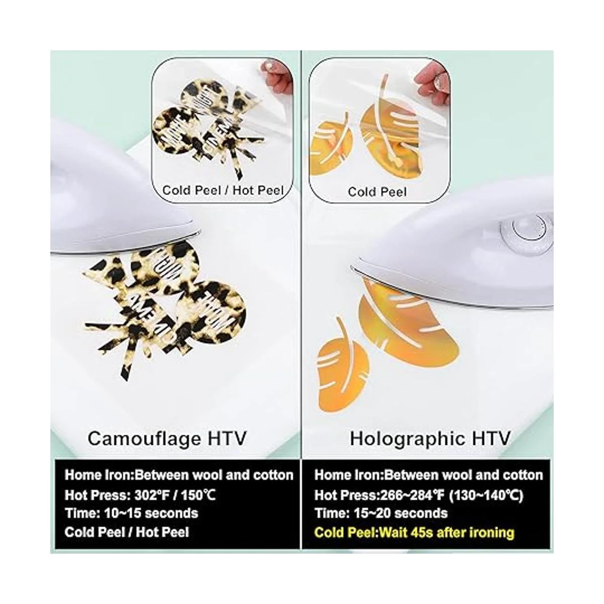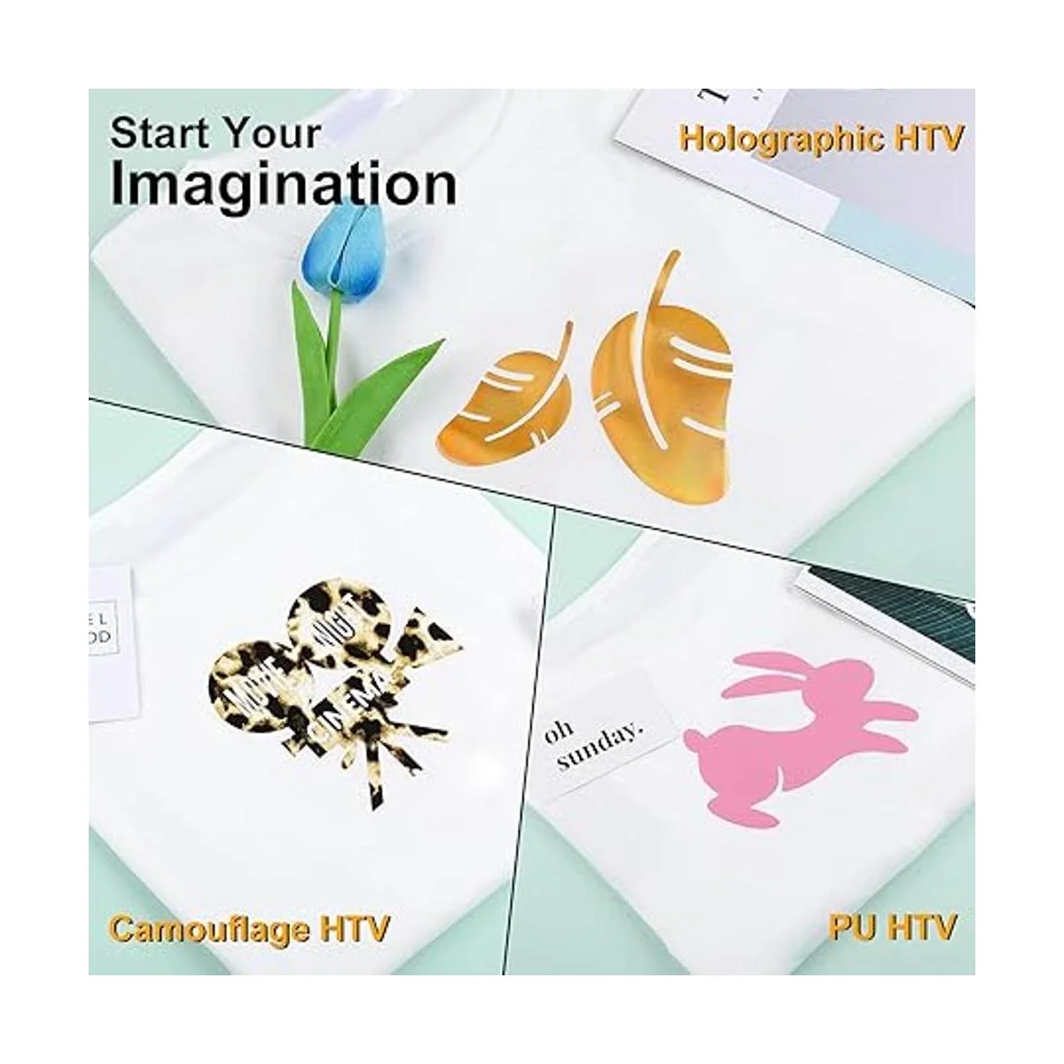 Combinación de colores vivos: Paquete de 75 vinilos de transferencia de calor coloridos de 12 x 10 pulgadas, paquete de 52 paquetes de vinilo colorido para planchar, 8 piezas HTV holográfico, 14 piezas Leopard HTV y camuflaje HTV, también incluye 1 herramienta de deshierbe.