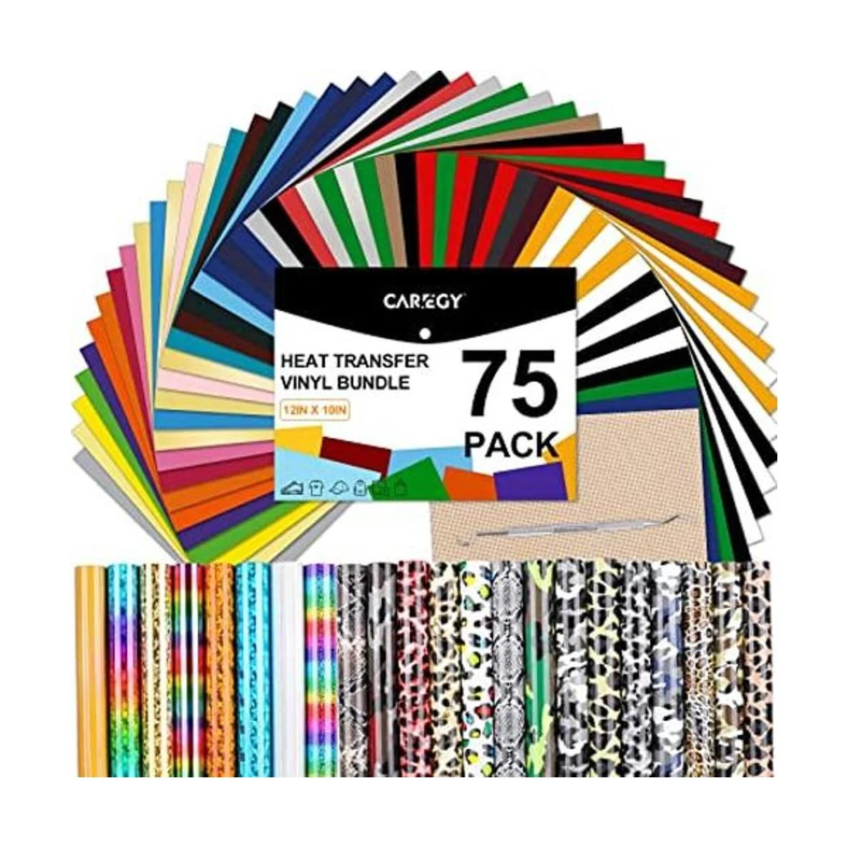 CAREGY Paquete de 75 vinilos termotransferibles HTV de 12 x 10 pulgadas, para planchar en camisetas, 57 colores surtidos con accesorios HTV y pinzas para todas las máquinas cortadoras o máquinas de prensa de calor