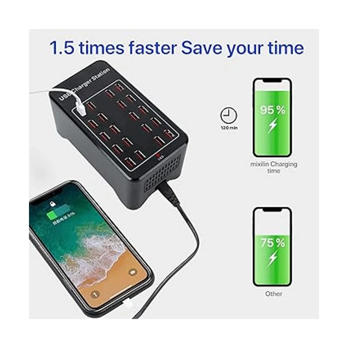 Cargador USB multipuerto: 30 puertos, la eficiencia de trabajo alcanza el 80, cada puerto proporciona 5 V/2.4 A de potencia, la potencia total de salida es de 150 W. Compatible con iPhone Xs/XS Max/XR/X/8/7/6s/Plus, iPad Pro/Air 2/Mini, Galaxy S9/S8/S7/Edge/Plus, Note 8/7, LG Nexus, HTC y Mo