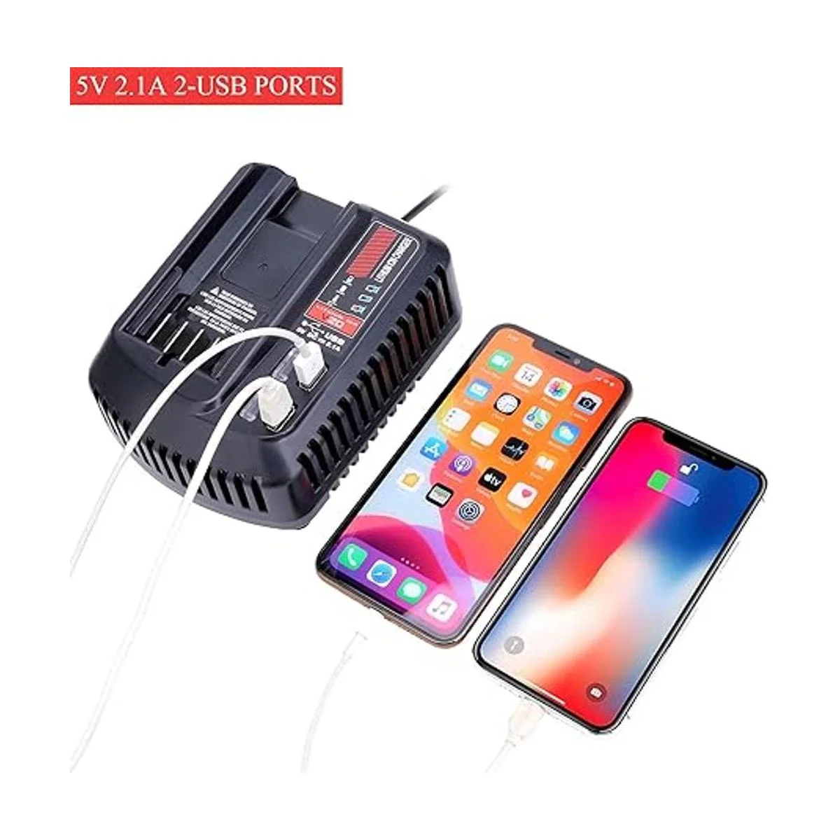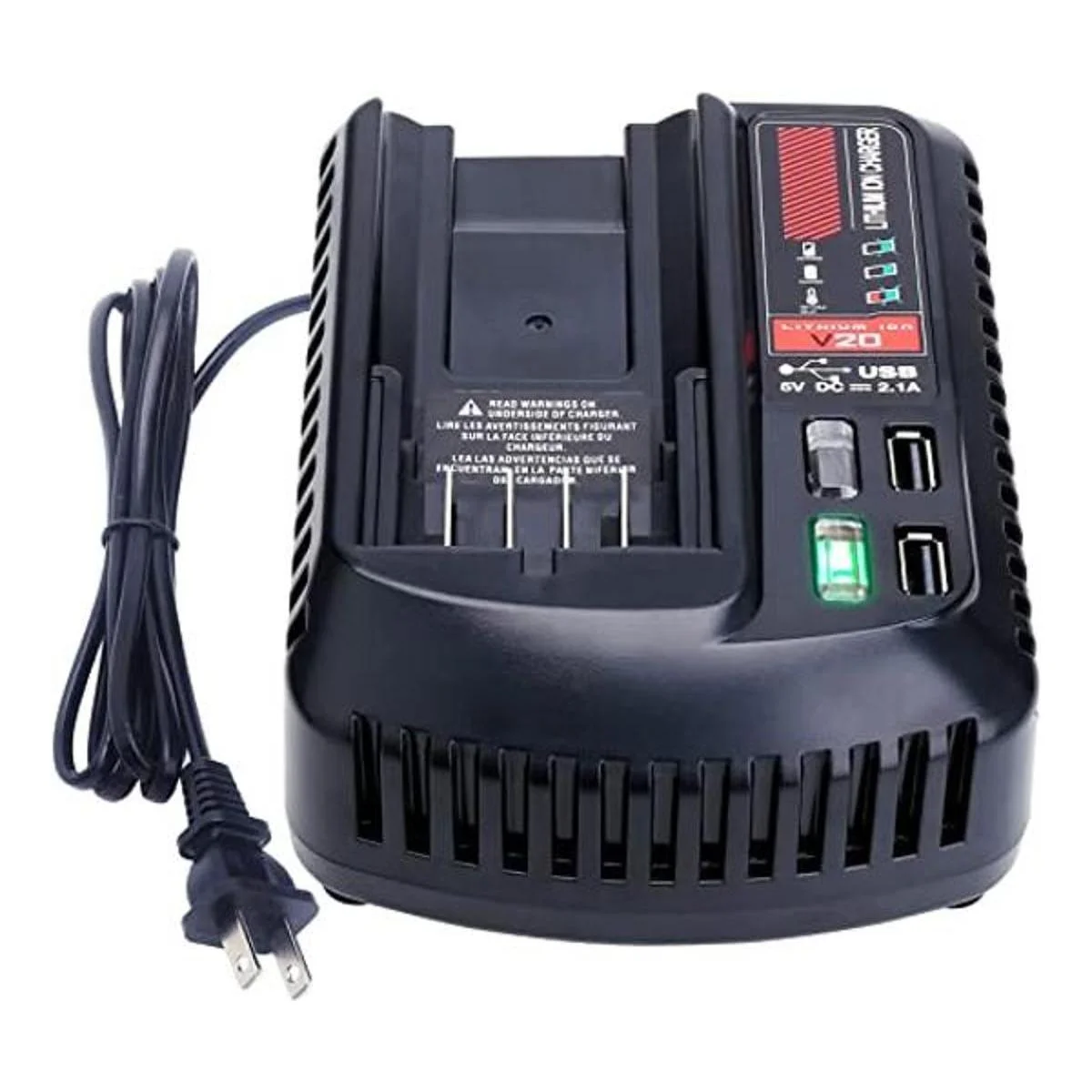Cargador de batería de herramientas CMCB104 con 2 puertos USB: requiere 100 V a 240 V, 60 Hz de potencia de entrada y utiliza el enchufe estándar de dos clavijas norteamericanas, aleta de refrigeración de aire integrada para enfriar la batería, carga baterías de litio V20 Max en 12 horas o menos, minimizando así el tiempo de inactividad; incluye dos puertos USB para cargar dispositivos compatibles como teléfonos celulares, iPod y tabletas.