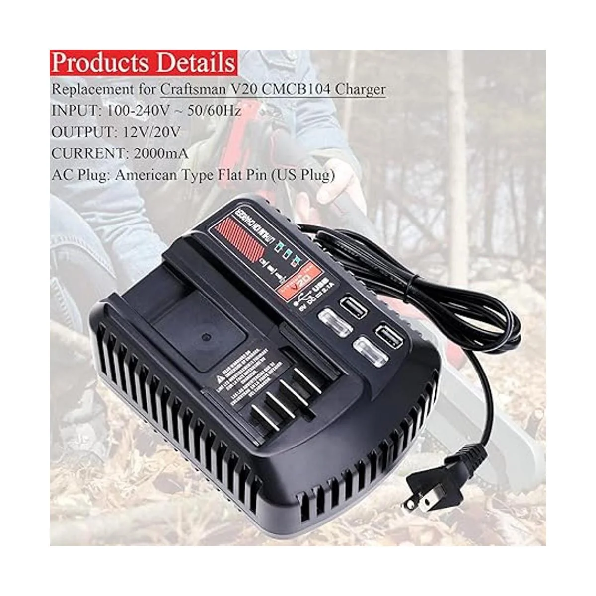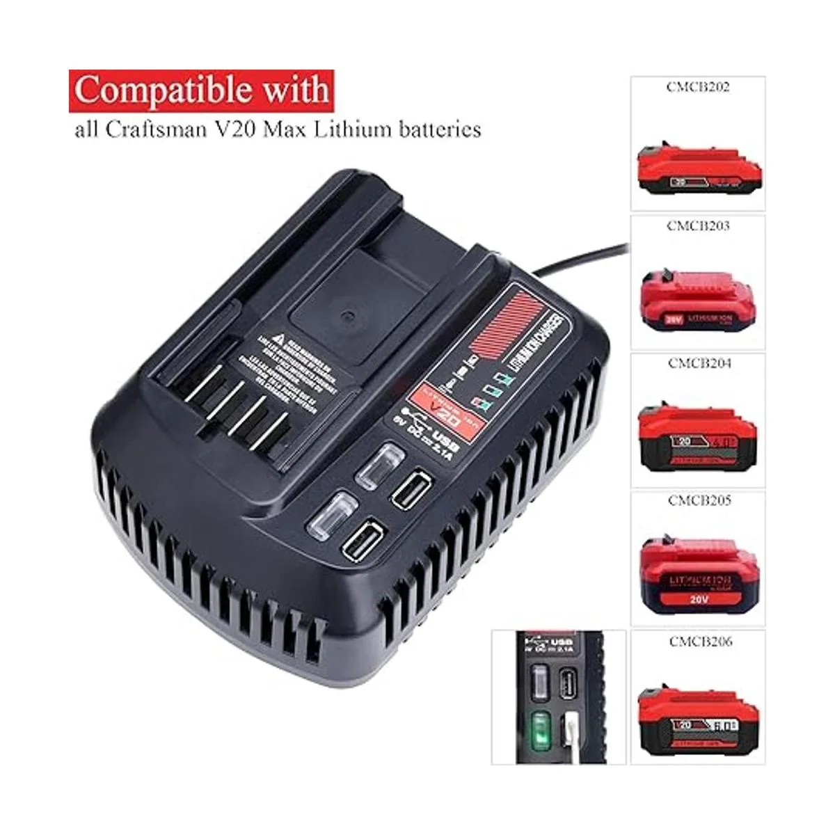 Repuesto para cargador Craftsman V20 de 20 V máximo: reemplazo perfecto para el cargador de batería original Craftsman de 20 voltios CMCB100, CMCB104, CMCB124; diagnóstico con indicador LED que comunica el estado de carga de la batería: cargada, carga y batería demasiado caliente o demasiado fría.