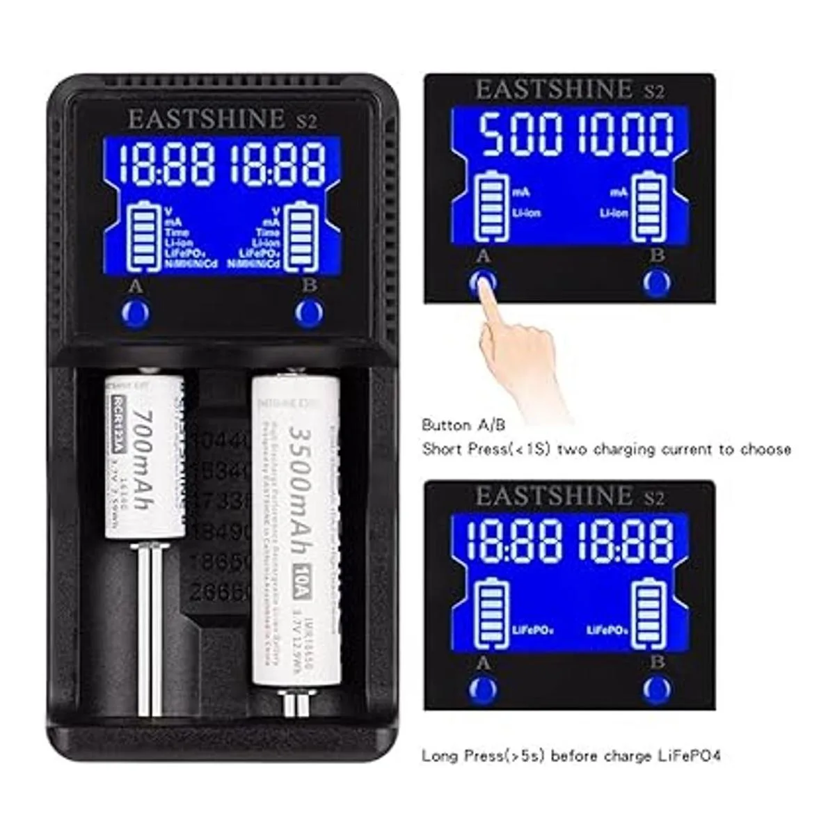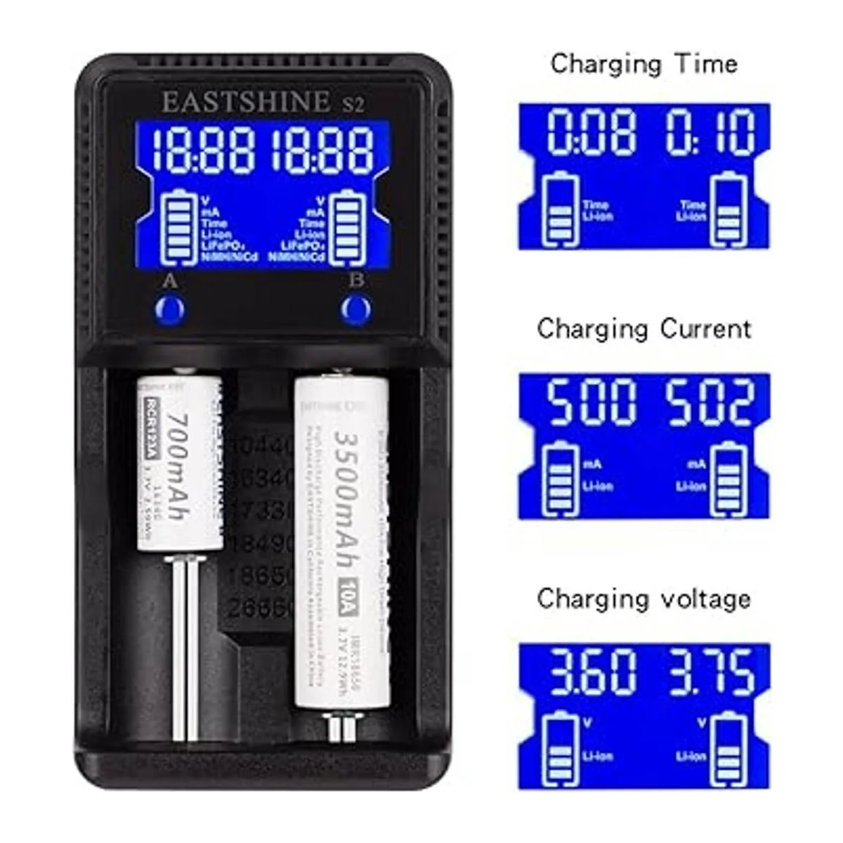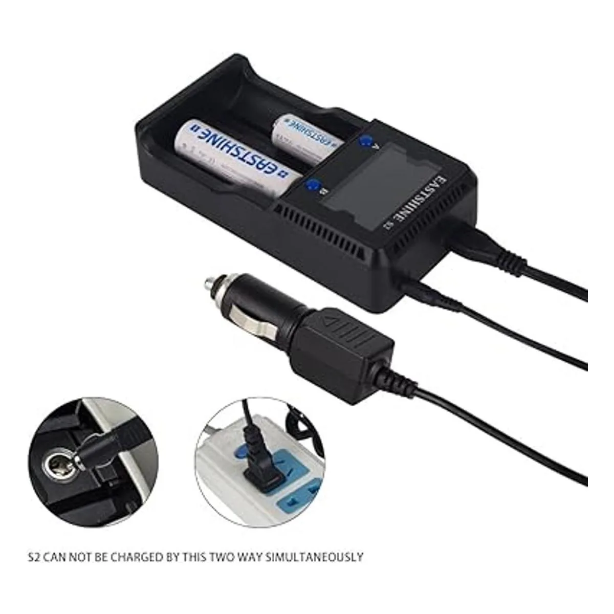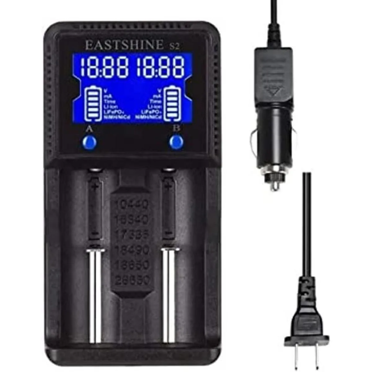 Cargador de batería universal EASTSHINE S2 LCD Display Speedy Smart Charger para baterías recargables NiMH NiCd AA AAA Liion LiFePO4 IMR 10440 14500 16340 18650 RCR123 26650 18500 17670 y adaptador de coche