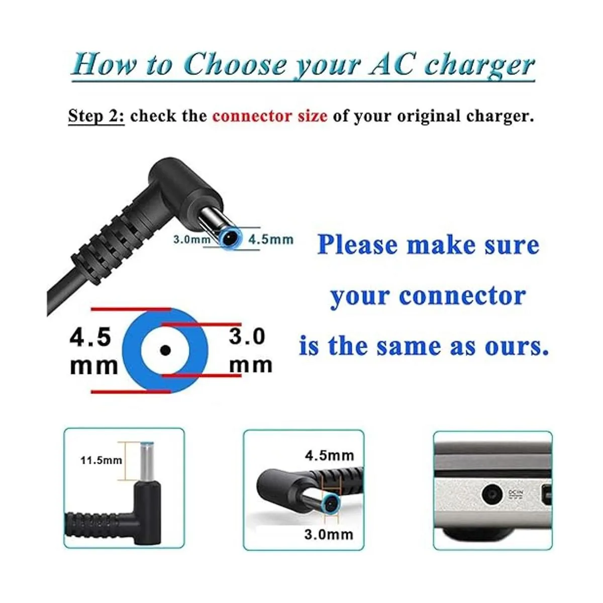Conector: punta azul de 0.177 in x 0.118 in asegúrate de que el tamaño del conector es el mismo que tu cargador original