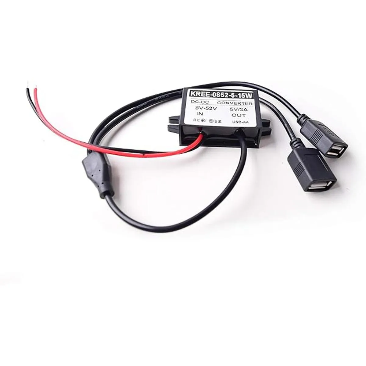 Convertidor universal CC 12/24/36/40/52 V a 5 V, cable de carga USB hembra dual. 852 V de entrada de amplio rango Corriente máxima 3 A, potencia 15 W. Ampliamente utilizado en camiones, caravanas, remolques, vehículos largos, coches, etc.