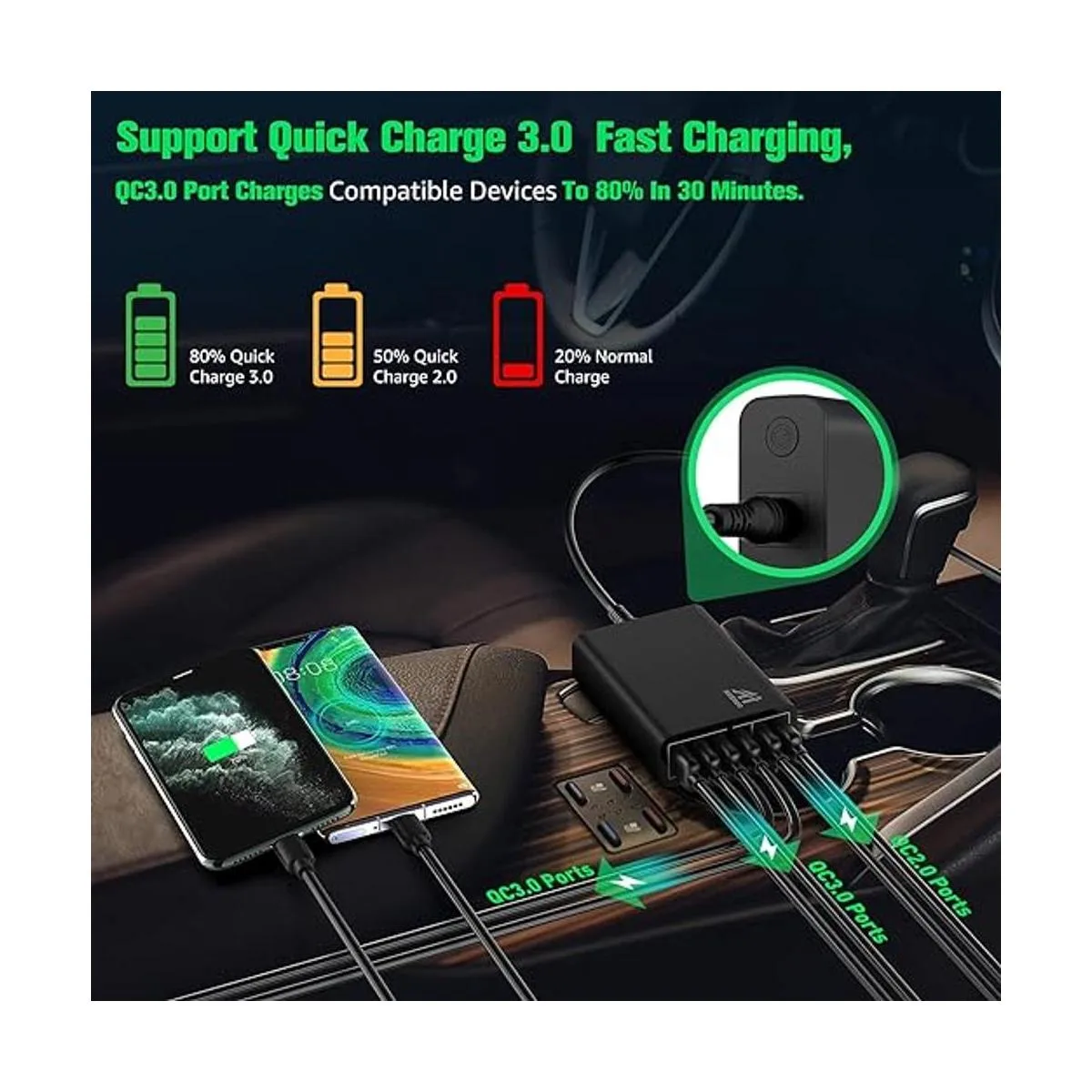 Carga simultánea: este cargador USB de coche de 6 puertos, viene con enchufe para encendedor de cigarrillos, cable de 3.28 pies, capacidad para proporcionar necesidades de carga del dispositivo tanto para asientos delanteros como traseros, soporta carga rápida de carga rápida, cada salida de puerto QC3.0 es de 18 W, cada salida de puerto QC2.0 es de 12 W, cargando múltiples dispositivos al mismo tiempo no resulta en carga lenta.