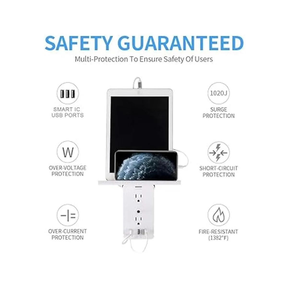 Más tomas: 8 tomas de corriente alterna a tierra 15 A/125 V con 3 puertos de carga USB Smart IC para alimentar cualquier teléfono inteligente incluyendo teléfono y Android, lámparas, ordenadores portátiles, secador de pelo u otros dispositivos electrónicos.