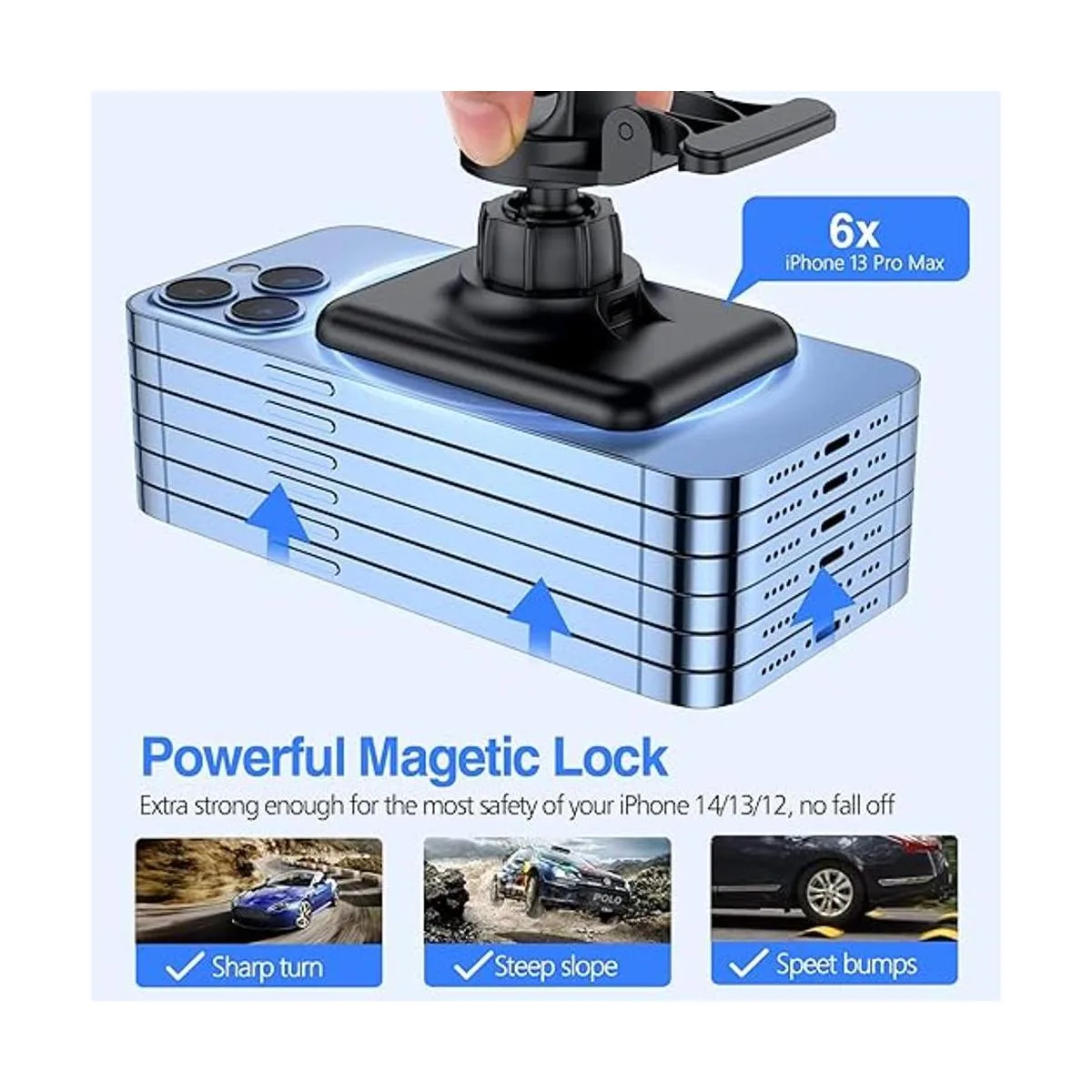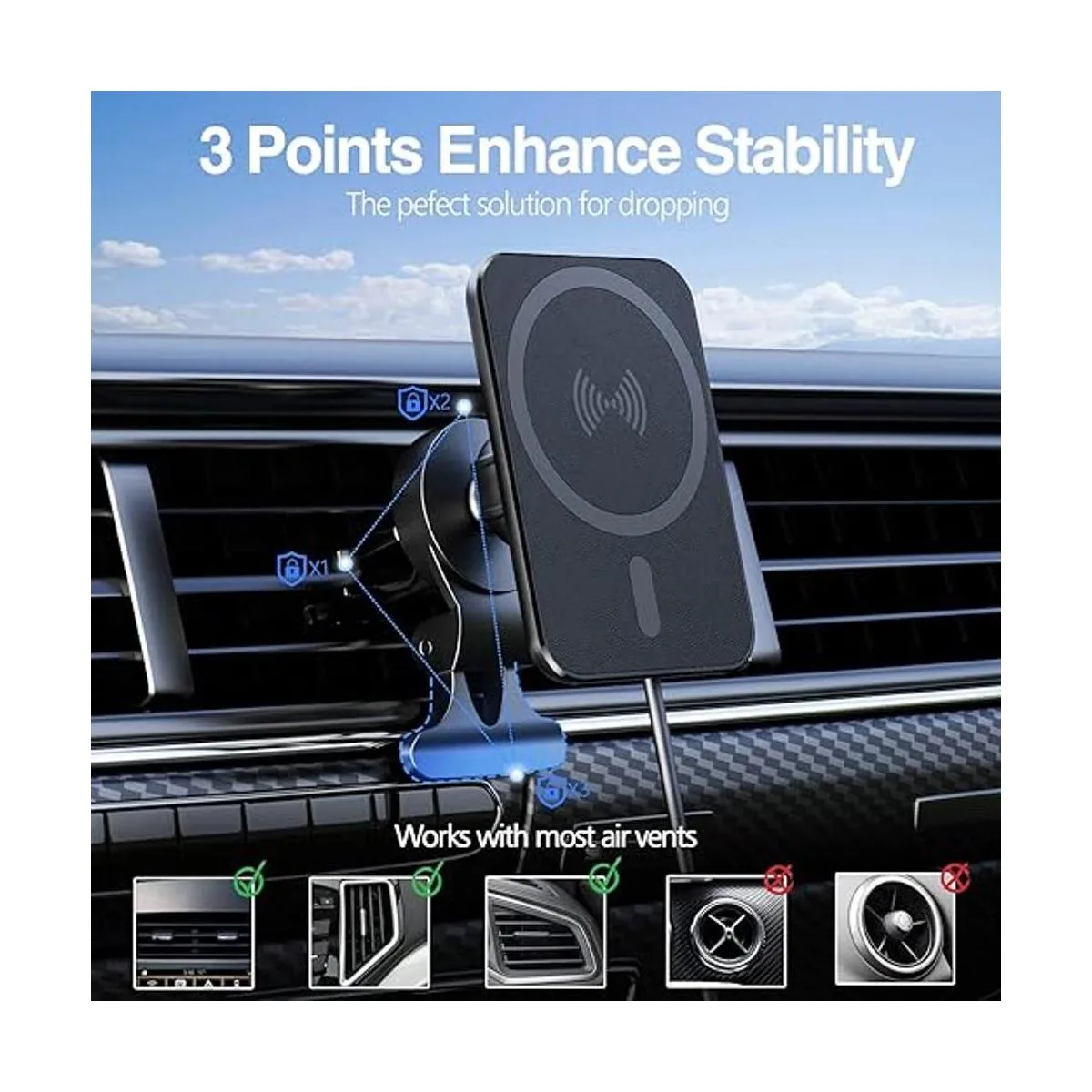 Soporte de ventilación mejorado: este cargador de coche seguro está diseñado con un fuerte clip de ventilación mejorado y un brazo de apoyo adicional de este cargador de coche Magsafe se bloqueará en tu ventilación de aire 100 de forma segura, nunca se caerá. La silicona suave en el clip de ventilación proporciona una potencia de sujeción más fuerte y al mismo tiempo protege tu hoja de ventilación de arañazos o deformaciones.