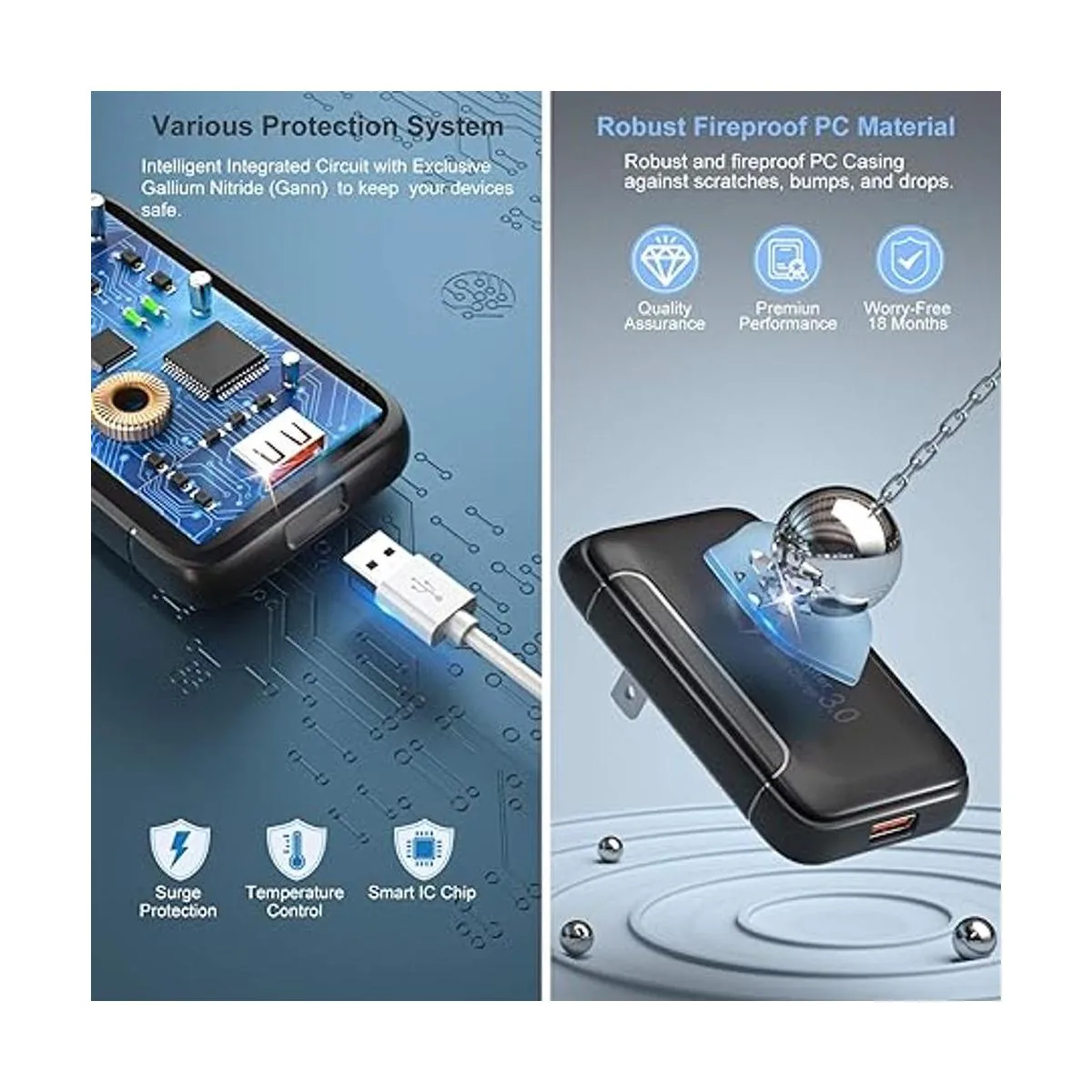 Construido en potente GaN nitruro de galio: el circuito integrado inteligente de tecnología GaN puede proporcionar una gran potencia en chip inteligente, reducir la pérdida de calor. El sistema de protección contra sobrecorriente, sobretensión, cortocircuito, sobrecarga y sobretemperatura garantiza una carga segura y rápida en tus dispositivos. La funda de PC robusta e ignífuga hace que este bloque de cargador tenga características anticaídas, antiarañazos y anticolisión, lo que hace que el cargador plano del teléfono sea más duradero.