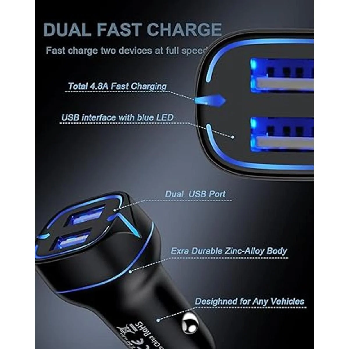Los cargadores de coche de doble puerto cargan 2 teléfonos inteligentes o i Pads simultáneamente que producen 2.4 A con un solo puerto y ambos 4.8 A. La luz LED suave indica conectar tu iPhone en un lugar oscuro.