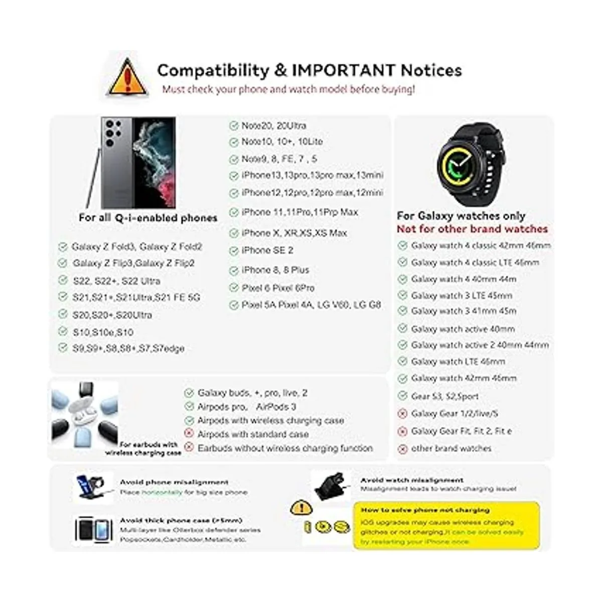 Amplia compatibilidad: la estación de carga para Samsung puede resolver fácilmente tu problema de carga multidispositivo. Carga inalámbrica de 10 W para Samsung Galaxy S22/S21/S20/S10/Note 20/Z Flip4/Z Fold4/Z Flip3/iPhone 14/14 pro max/14 plus/14 pro/13/12/11/XS MAX/XR/X/8; carga inalámbrica de 5 W para Galaxy Watch 5/5 Pro/4/4/4/4/4/4/4/4/4/4/4 Clásico 42/1.811 in/Galaxy Watch 3/Galaxy Active 1/2 1.575 in/1.732 in; carga inalámbrica de 2.5W para Galaxy Buds 2/Pro//Buds Live y otros auriculares con funda de carga inalámbrica. Nota: no apto para Apple Watch