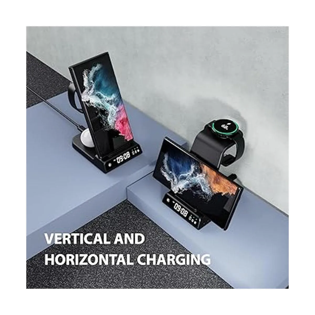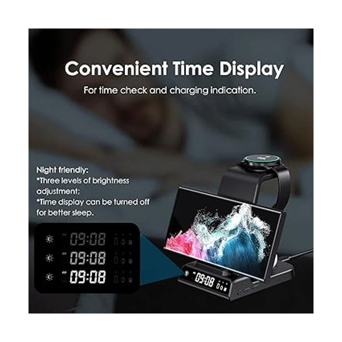 Base de carga con reloj digital: la estación de carga inalámbrica Samsung tiene una base de reloj digital especial, con ajuste regulable para evitar reflejos por la noche. No tienes que comprar un reloj adicional, solo tienes que utilizar el cargador inalámbrico para comprobar la hora mientras cargas tus dispositivos Samsung 4 modos de luz LED cíclico: bajo, medio, alto y apagado. Haz clic en el icono del sol cada vez para cambiar el modo de luz