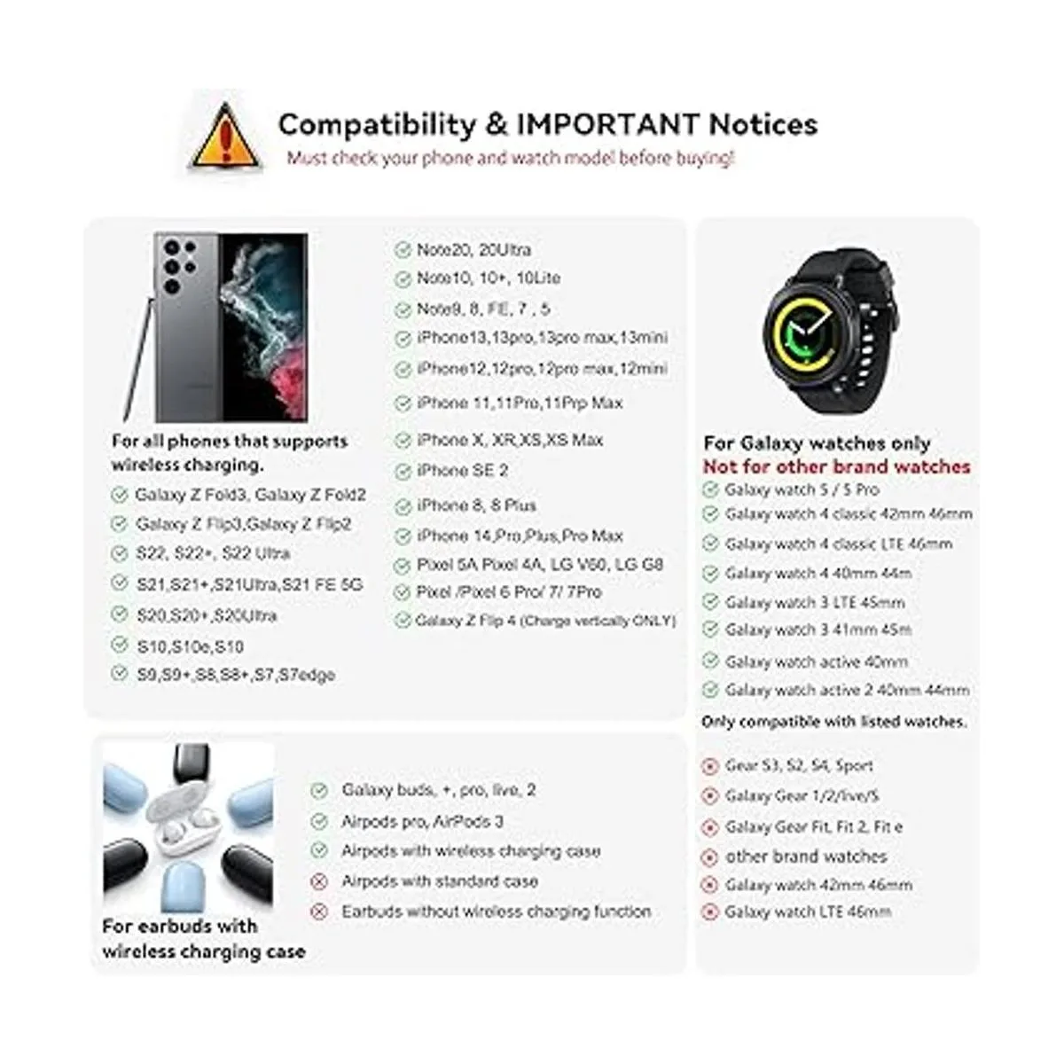 Compatibilidad universal: esta estación de carga inalámbrica para Samsung es compatible con Samsung Galaxy S22 Ultra/S22/S22/S21/S1/S21 Ultra/S20/S20/S20 Ultra, Galaxy Z Series Flip/Flip 3/Fold 3, Note 20/10/9/8/7, cargador inalámbrico para Samsung Galaxy Watch 5/5 Pro/4 1.575 in 1.732 in/4 Classic/3/Active 2/1, etc. No para Gear 1/2ve/S/Gear Fit/2/e/Galaxy Watch/Gear S3 S2 S4, Sport; para Samsung Buds//Pro/Live.