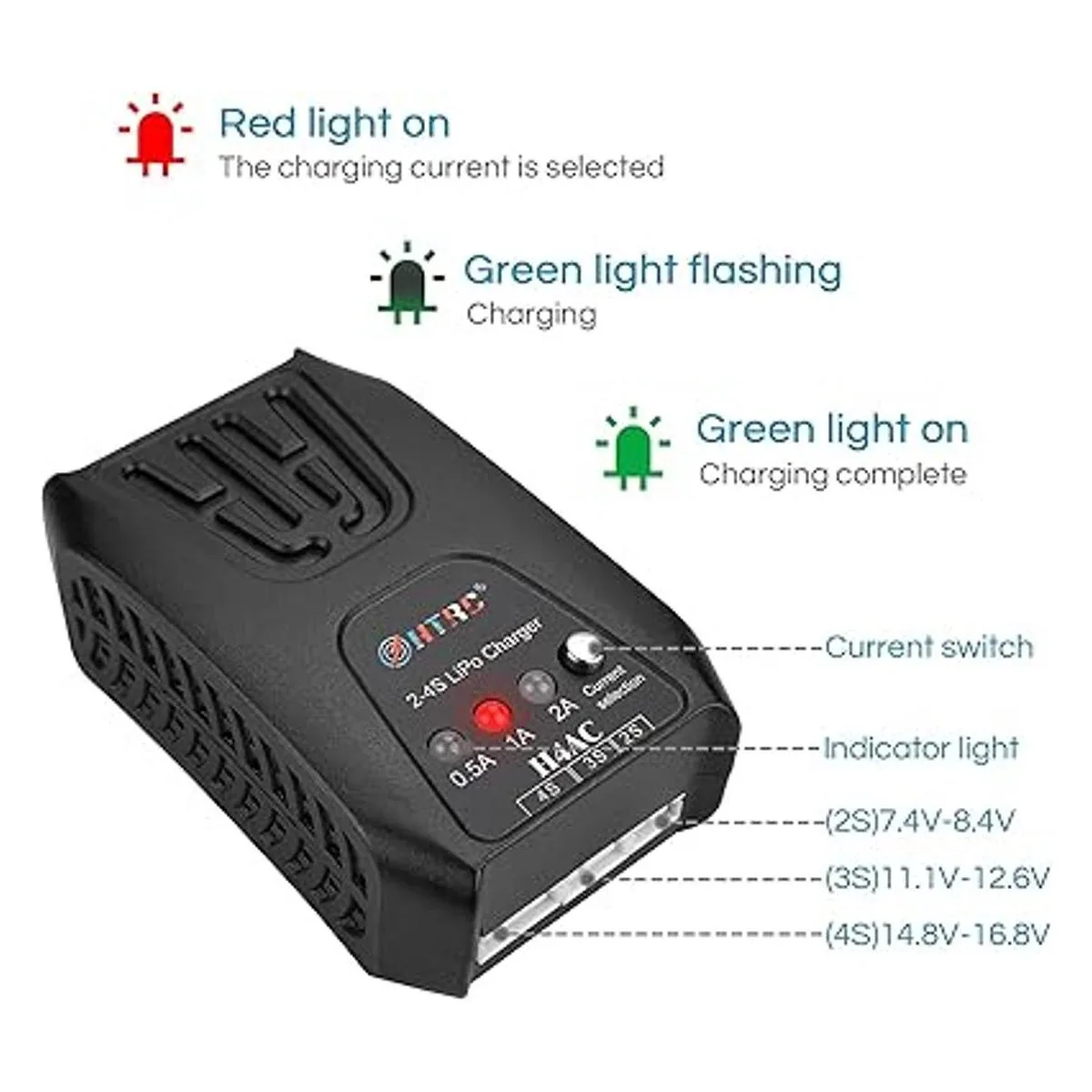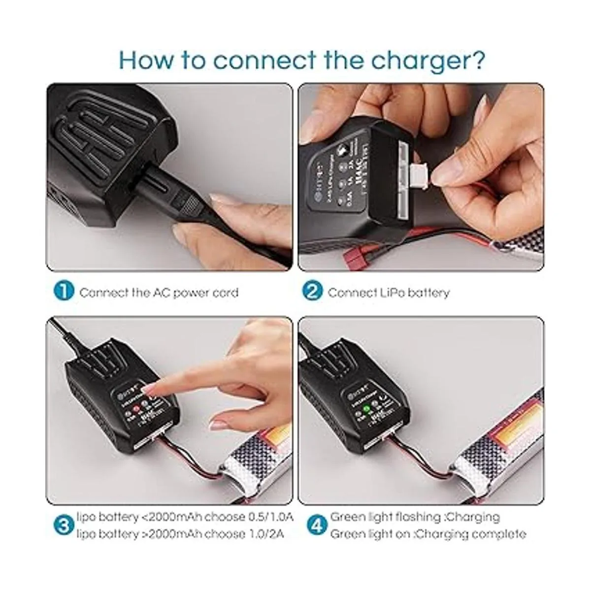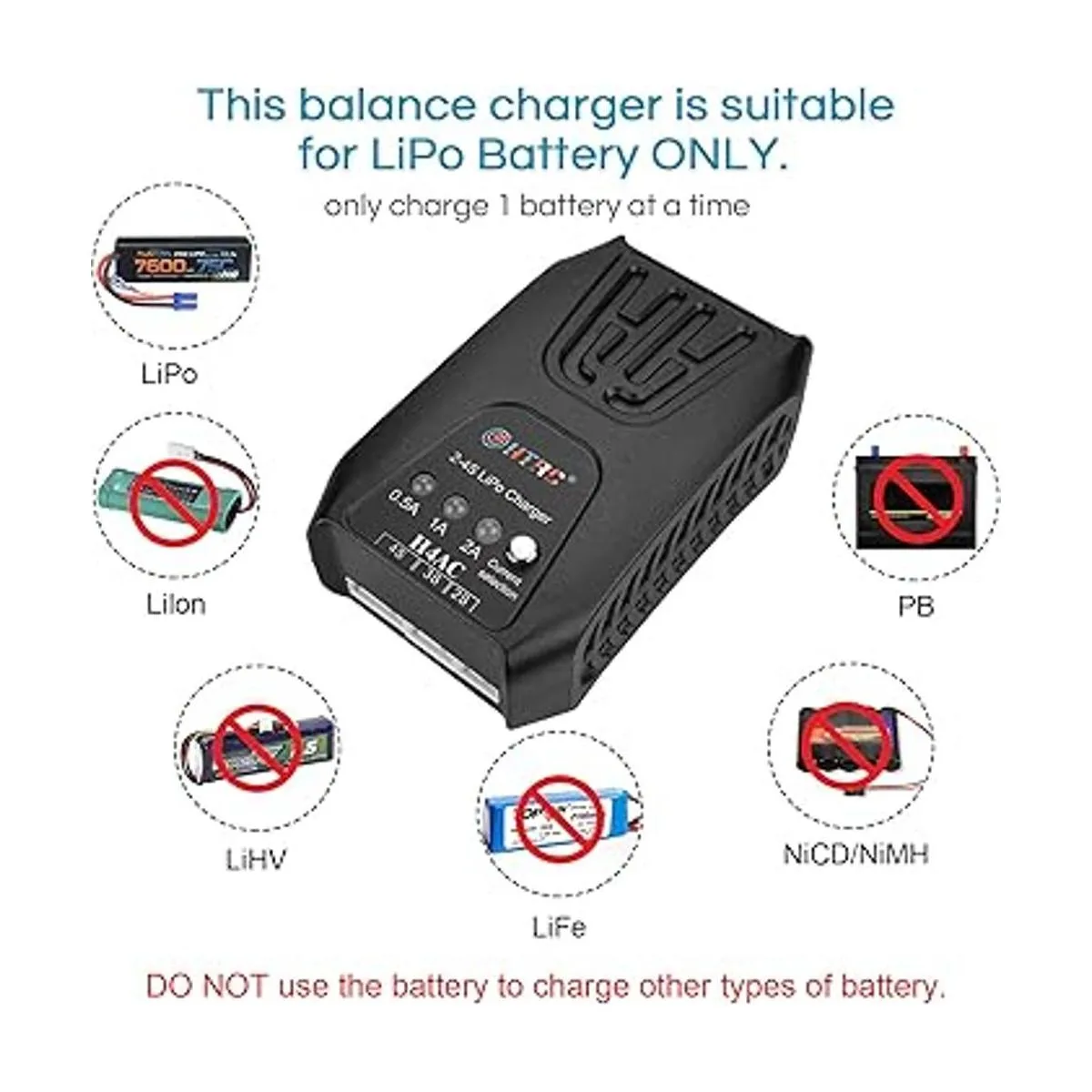 Solo para batería Lipo: el cargador de batería Lipo es perfecto para tus necesidades de pasatiempo. Está diseñado específicamente para 2S 3S 4S 7. Batería Lipo de 4 a 14,8 V. Tiene una potente corriente de carga de hasta 2 A. Nota: este cargador compacto de equilibrio es solo adecuado para batería LiPo, solo carga una batería 24S Lipo a la vez.